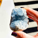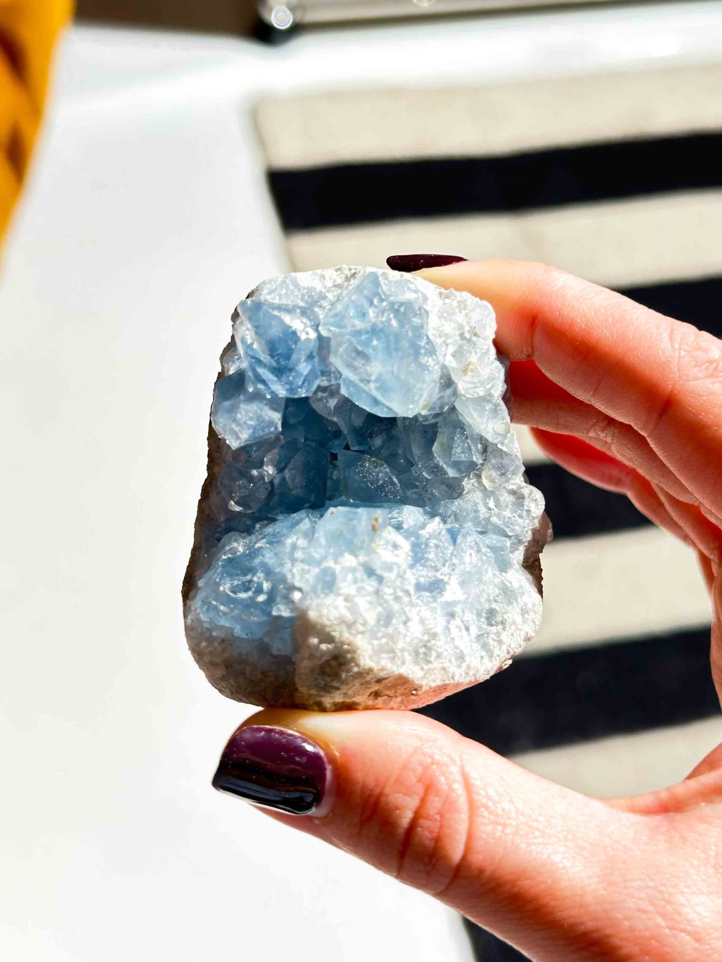 Αυτό το μοναδικό πέτρωμα αποκαλύπτει την απαλή και εκθαμβωτική ομορφιά του Σελεστίνης, με χαρακτηριστική διαφανή έως γαλάζια απόχρωση που θυμίζει το φως του ουρανού. Κάθε κομμάτι λάμπει με φυσικό τρόπο, δημιουργώντας μοναδικά μοτίβα και αντανακλάσεις που μαγνητίζουν το βλέμμα.
