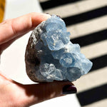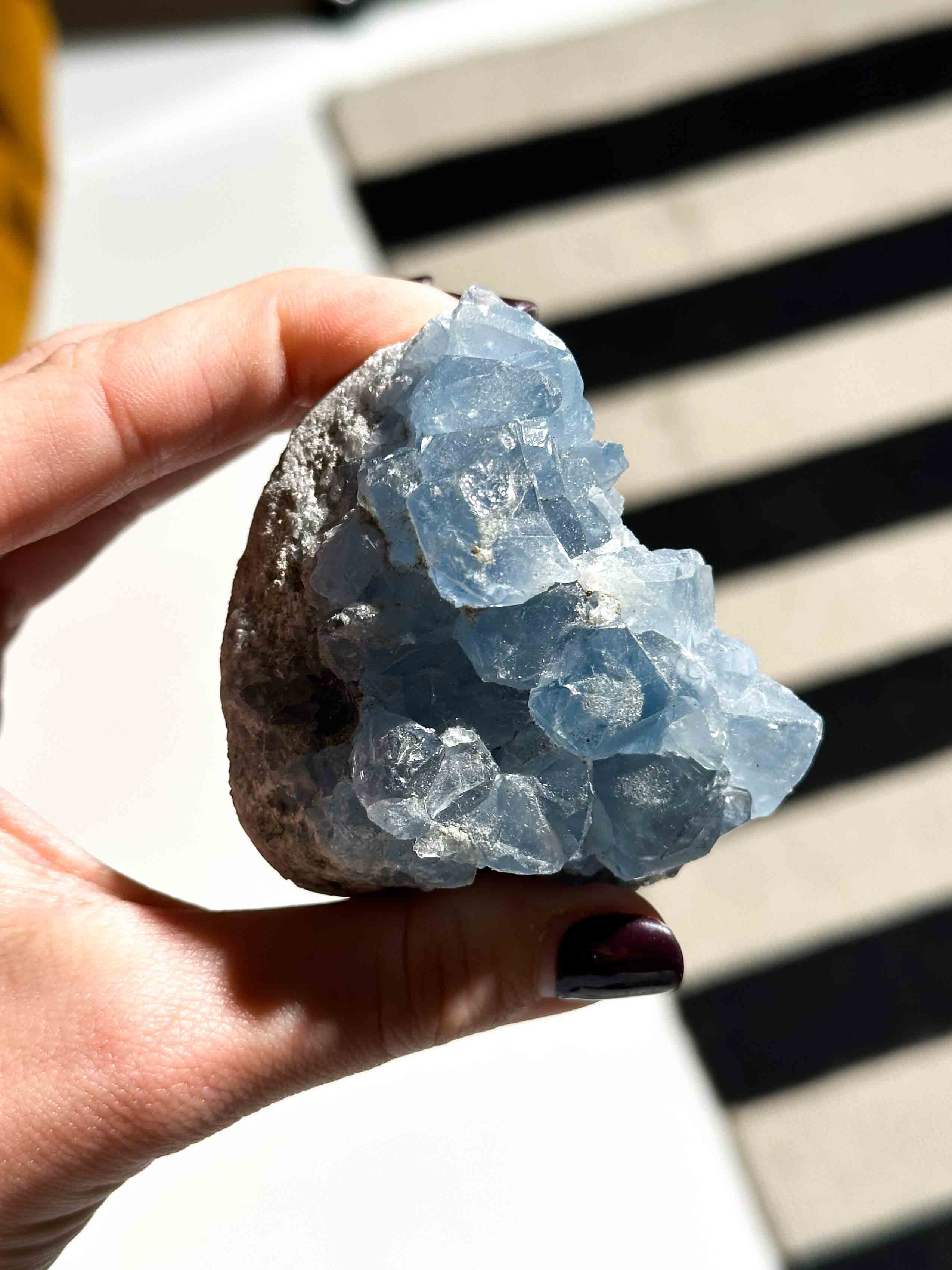 Αυτό το μοναδικό πέτρωμα αποκαλύπτει την απαλή και εκθαμβωτική ομορφιά του Σελεστίνης, με χαρακτηριστική διαφανή έως γαλάζια απόχρωση που θυμίζει το φως του ουρανού. Κάθε κομμάτι λάμπει με φυσικό τρόπο, δημιουργώντας μοναδικά μοτίβα και αντανακλάσεις που μαγνητίζουν το βλέμμα.
