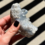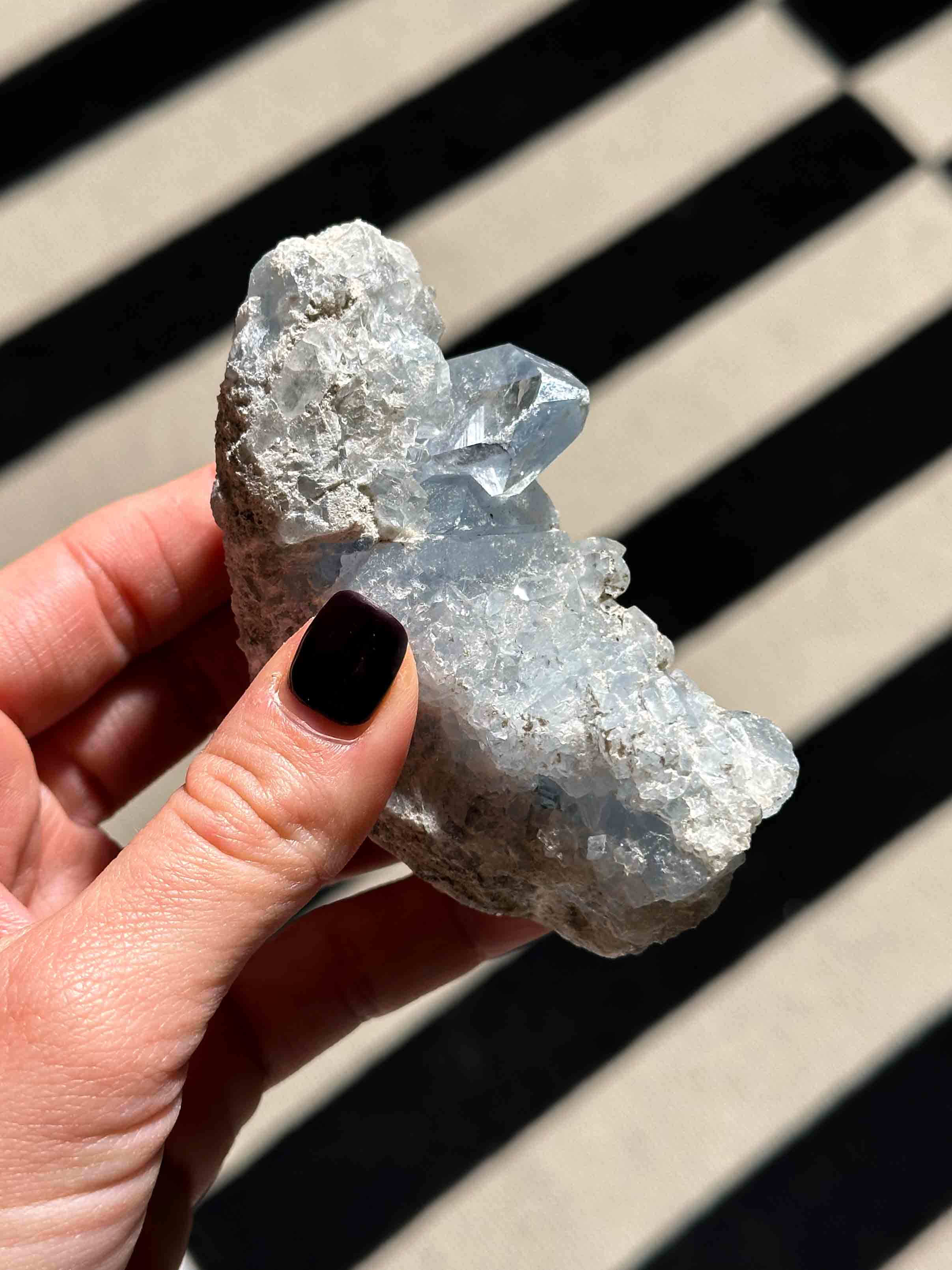 Αυτό το μοναδικό πέτρωμα αποκαλύπτει την απαλή και εκθαμβωτική ομορφιά του Σελεστίνης, με χαρακτηριστική διαφανή έως γαλάζια απόχρωση που θυμίζει το φως του ουρανού. Κάθε κομμάτι λάμπει με φυσικό τρόπο, δημιουργώντας μοναδικά μοτίβα και αντανακλάσεις που μαγνητίζουν το βλέμμα.
