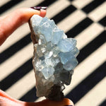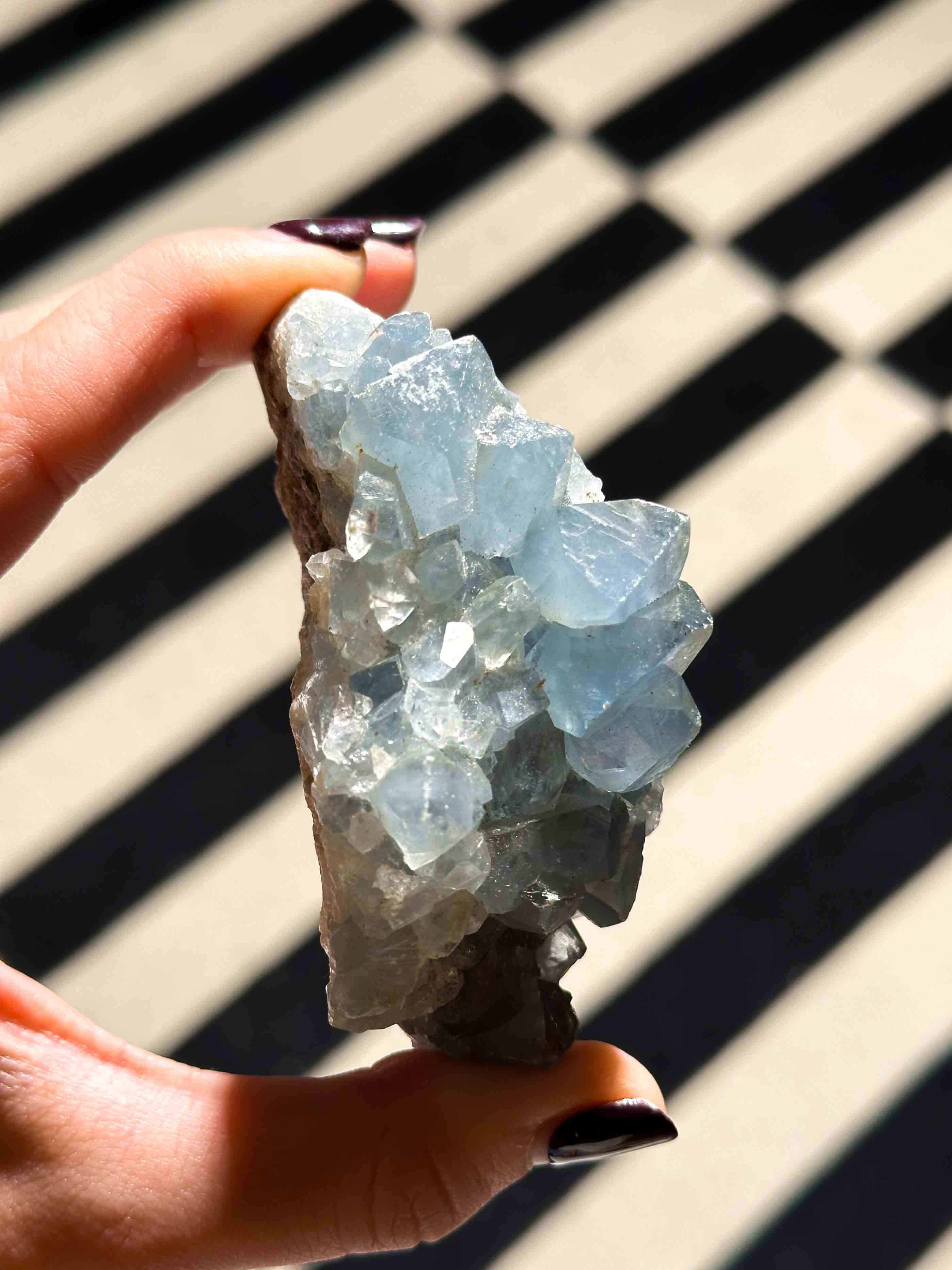 Αυτό το μοναδικό πέτρωμα αποκαλύπτει την απαλή και εκθαμβωτική ομορφιά του Σελεστίνης, με χαρακτηριστική διαφανή έως γαλάζια απόχρωση που θυμίζει το φως του ουρανού. Κάθε κομμάτι λάμπει με φυσικό τρόπο, δημιουργώντας μοναδικά μοτίβα και αντανακλάσεις που μαγνητίζουν το βλέμμα.