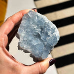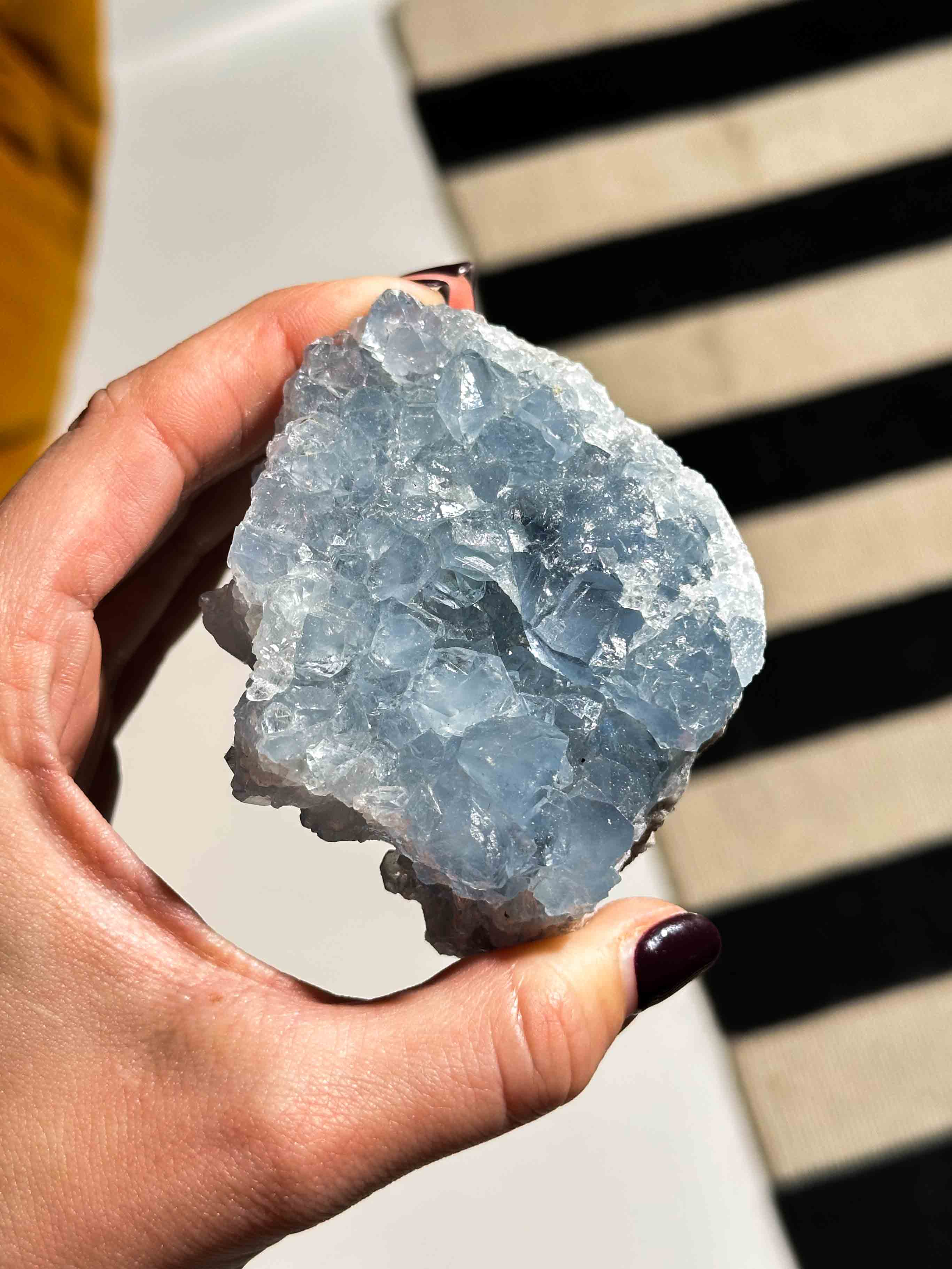 Αυτό το μοναδικό πέτρωμα αποκαλύπτει την απαλή και εκθαμβωτική ομορφιά του Σελεστίνης, με χαρακτηριστική διαφανή έως γαλάζια απόχρωση που θυμίζει το φως του ουρανού. Κάθε κομμάτι λάμπει με φυσικό τρόπο, δημιουργώντας μοναδικά μοτίβα και αντανακλάσεις που μαγνητίζουν το βλέμμα.