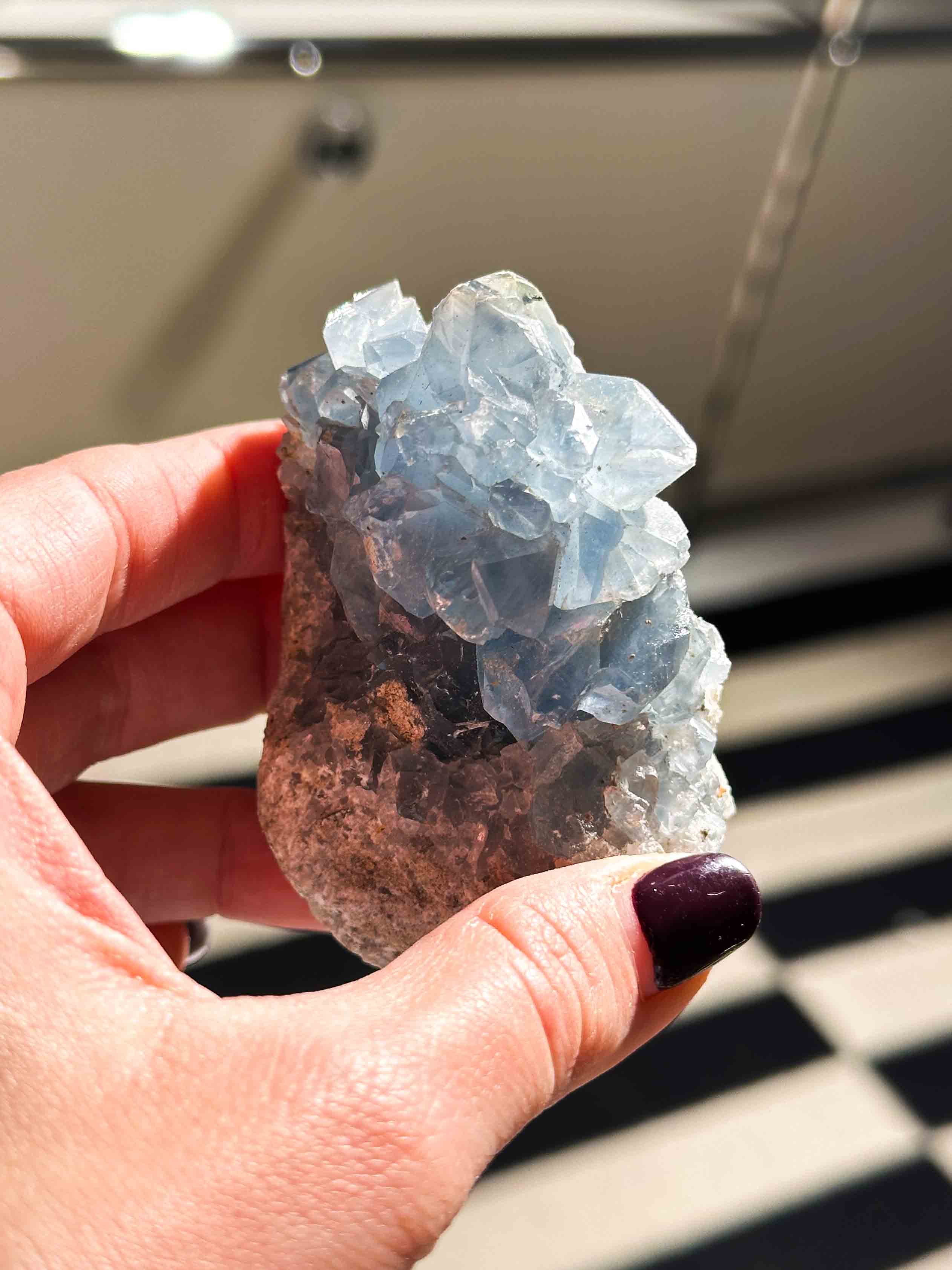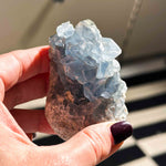 Αυτό το μοναδικό πέτρωμα αποκαλύπτει την απαλή και εκθαμβωτική ομορφιά του Σελεστίνης, με χαρακτηριστική διαφανή έως γαλάζια απόχρωση που θυμίζει το φως του ουρανού. Κάθε κομμάτι λάμπει με φυσικό τρόπο, δημιουργώντας μοναδικά μοτίβα και αντανακλάσεις που μαγνητίζουν το βλέμμα.