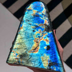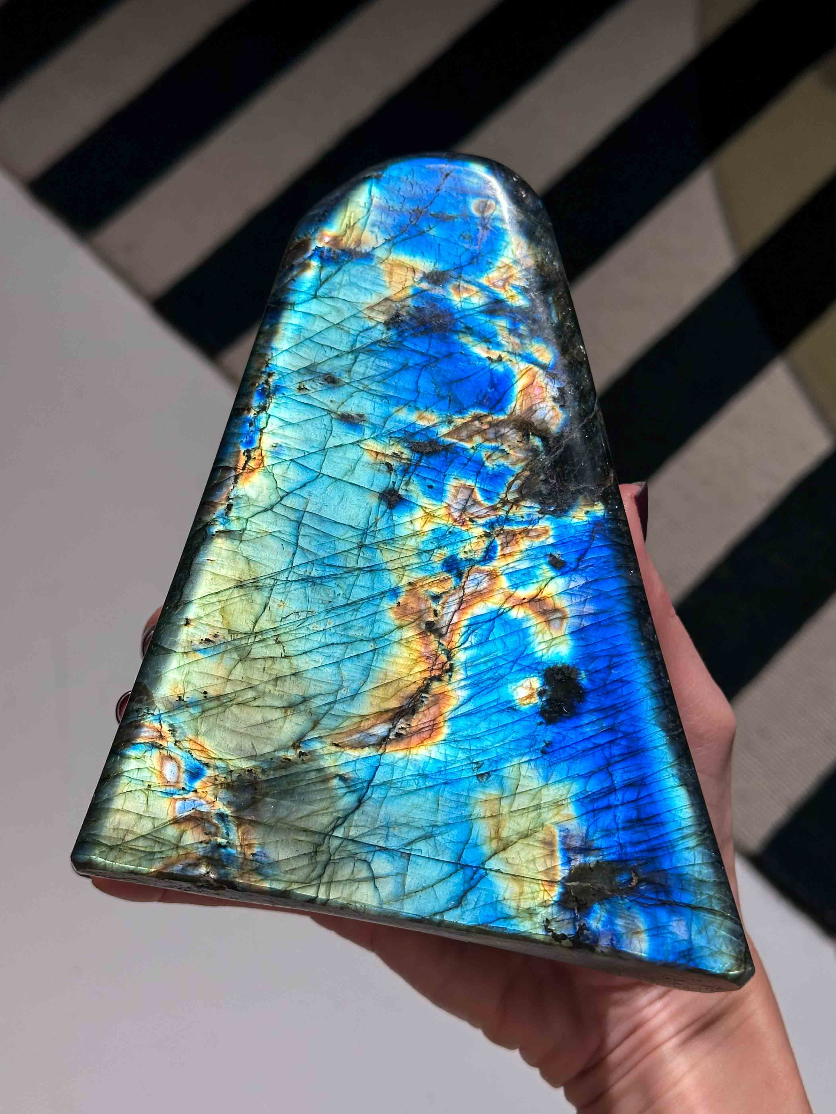 Αυτός ο Λαβραδορίτης διακρίνεται για τον πλούσιο, βαθύ μπλε ιριδισμό του (labradorescence) που καλύπτει την πέτρα σαν κύμα. Η γυαλισμένη του όψη είναι λεία στην αφή, ενώ οι φυσικές εσωτερικές γραμμές του προσθέτουν μοναδική υφή στην εμφάνισή του.