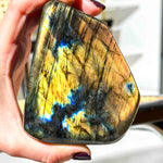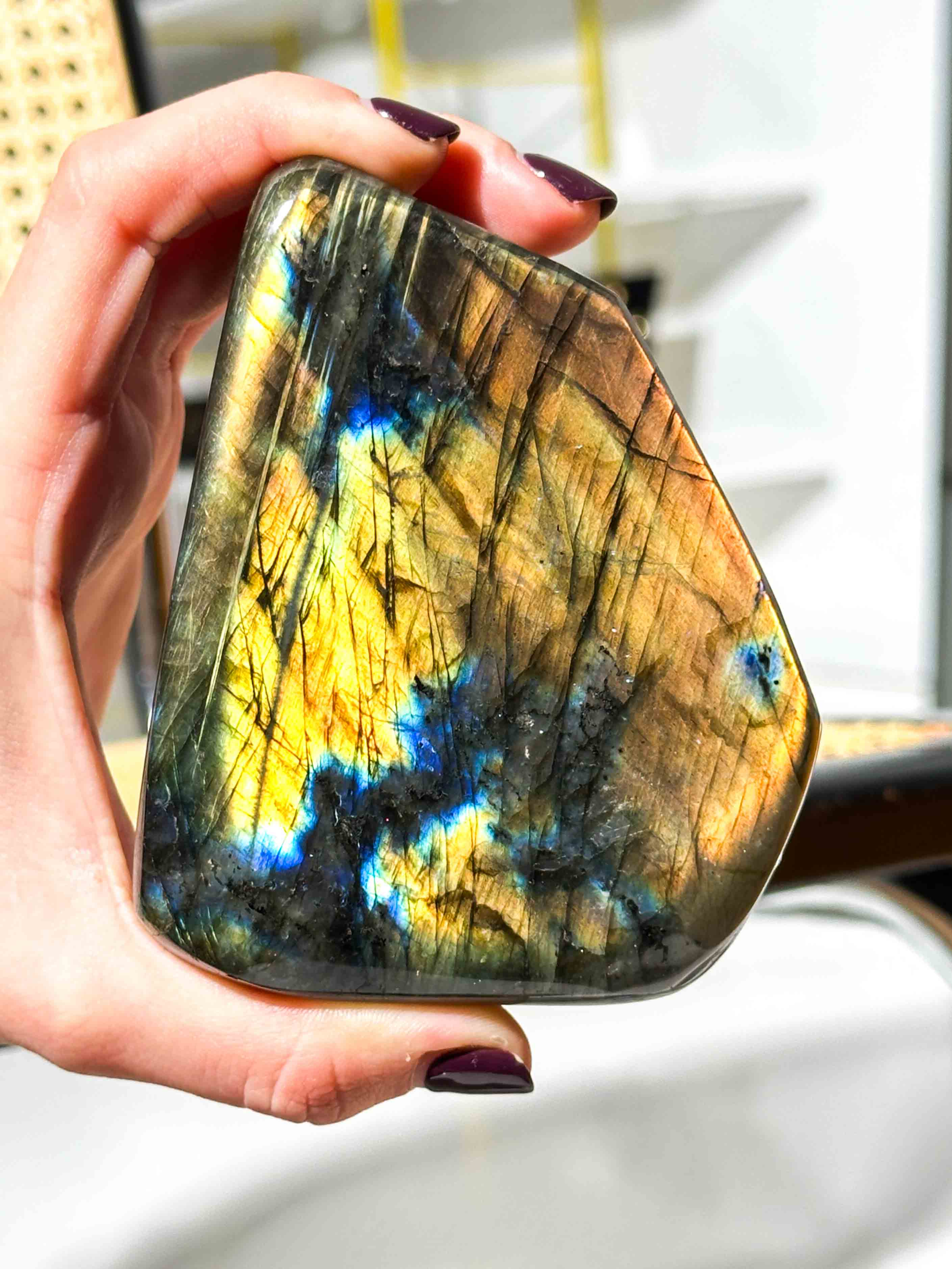 Αυτό το γυαλισμένο freeform κομμάτι ξεχωρίζει για τον εντυπωσιακό, φλογερό χρυσό ιριδισμό του (labradorescence) που καλύπτει σχεδόν όλη την επιφάνεια, "σπάζοντας" με φυσικά μοτίβα και ίχνη βαθύ μπλε χρώματος.