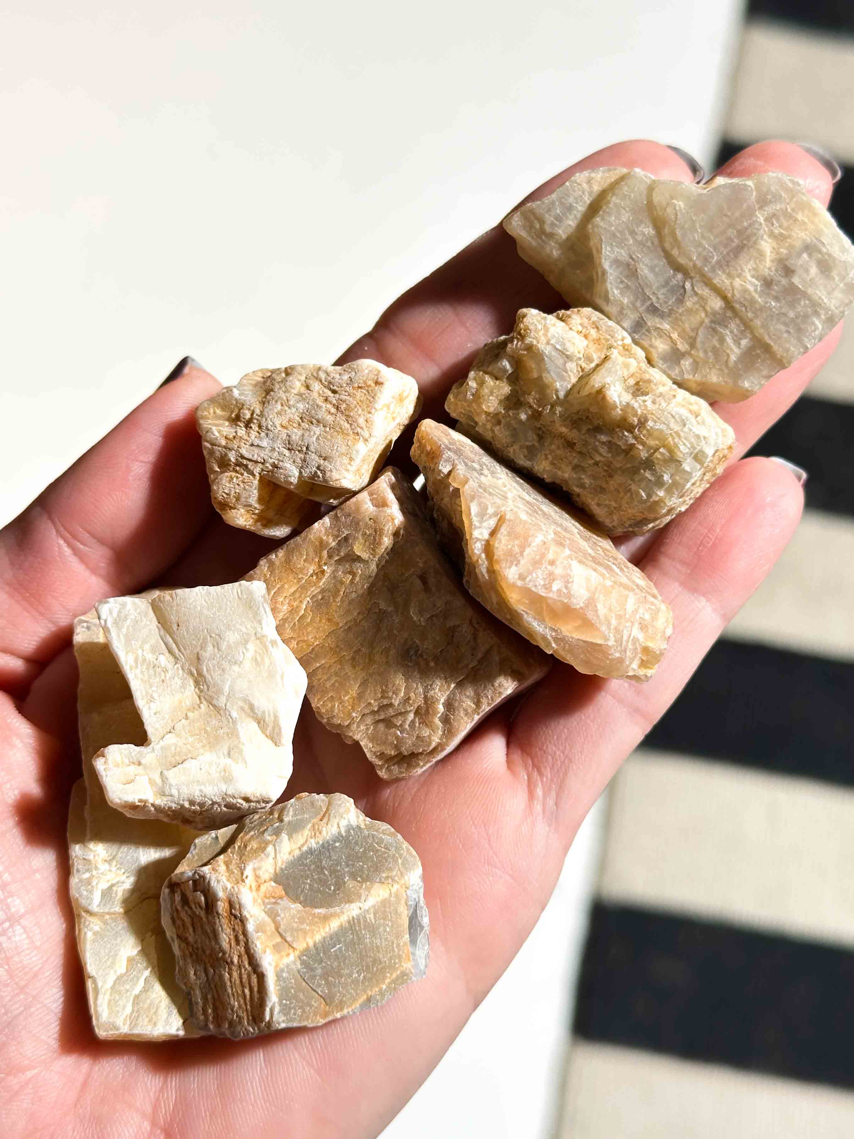 Η Φεγγαρόπετρα φημίζεται για τις ηρεμιστικές και ενισχυτικές της ιδιότητες, προάγοντας τη διαύγεια, την εσωτερική ισορροπία και τη σύνδεση με τη διαίσθηση. Κάθε ακατέργαστο κομμάτι είναι μοναδικό, με φυσικά σχήματα και υφές που μαγνητίζουν το βλέμμα, ιδανικό για συλλέκτες ή ως φυσικό διακοσμητικό στοιχείο.