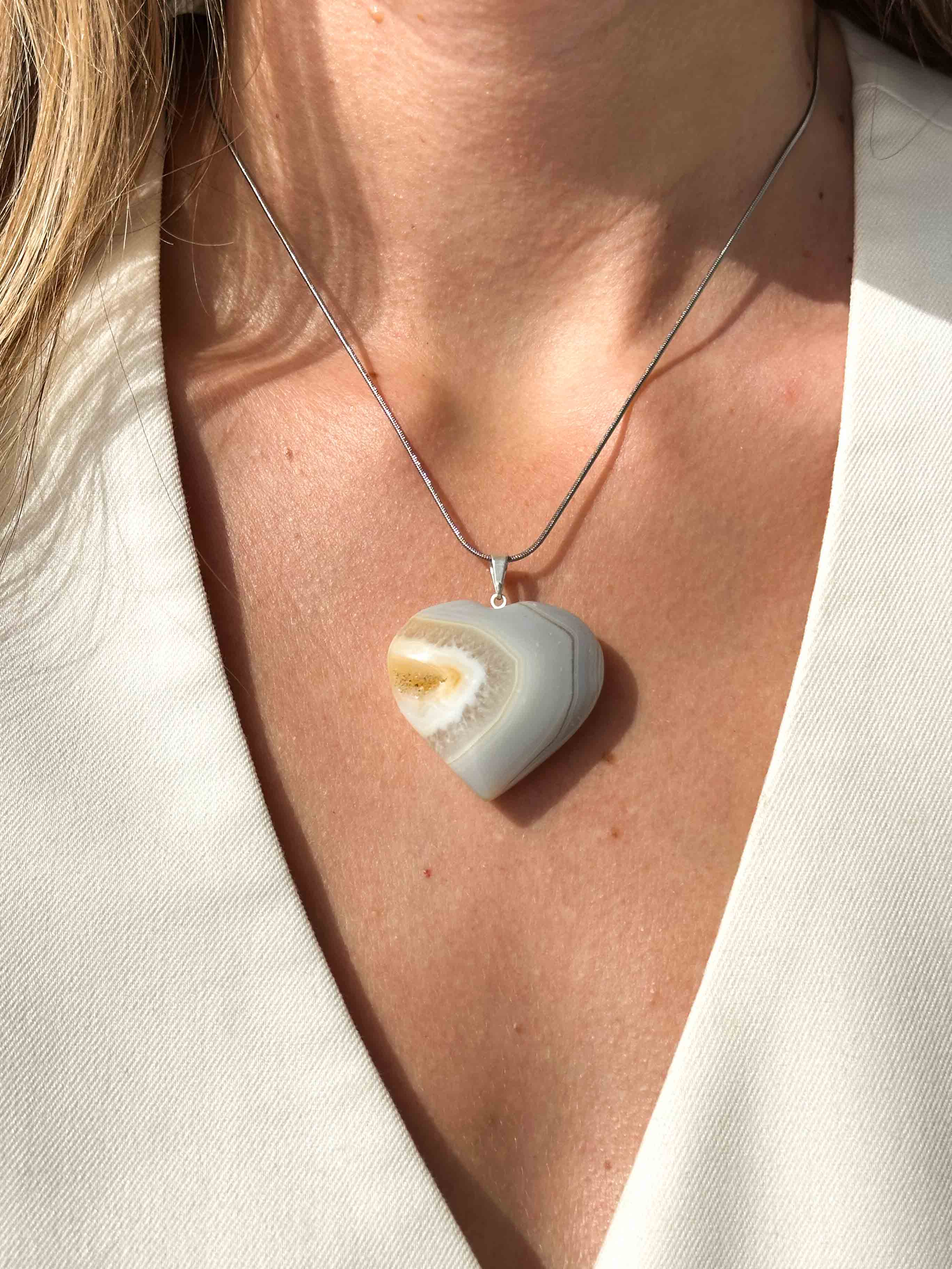 Ένα γήινο φυλαχτό που χαρίζει ισορροπία και σταθερότητα. Ο αχάτης είναι γνωστός για την προστατευτική του ενέργεια, την ηρεμία που προσφέρει και τη δύναμή του να ενισχύει την αυτοπεποίθηση. Σκαλισμένο σε σχήμα καρδιάς, συμβολίζει αγάπη, γείωση και αρμονία. Συνοδεύεται από την αλυσίδα του, έτοιμο να φορεθεί ή να προσφερθεί ως δώρο με νόημα.