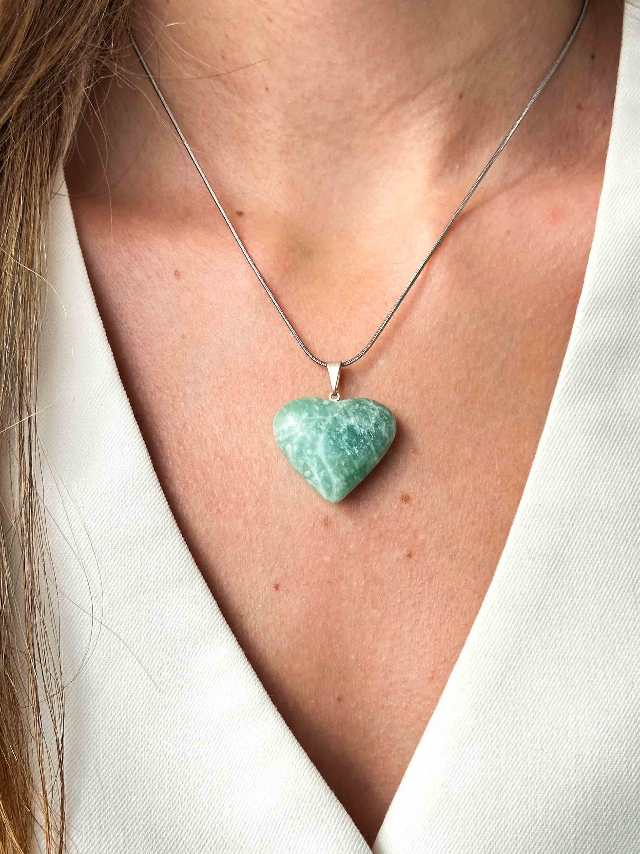 Ένα κόσμημα που συνδυάζει κομψότητα και θετική ενέργεια. Ο αμαζονίτης, γνωστός ως «πέτρα της γαλήνης», φέρνει ηρεμία, ισορροπία και ενισχύει την επικοινωνία με αλήθεια και καθαρότητα. Το μενταγιόν είναι σκαλισμένο σε σχήμα καρδιάς, ιδανικό για να εκφράσει αγάπη και τρυφερότητα, ενώ συνοδεύεται από την αλυσίδα του, έτοιμο να φορεθεί ή να προσφερθεί ως δώρο.