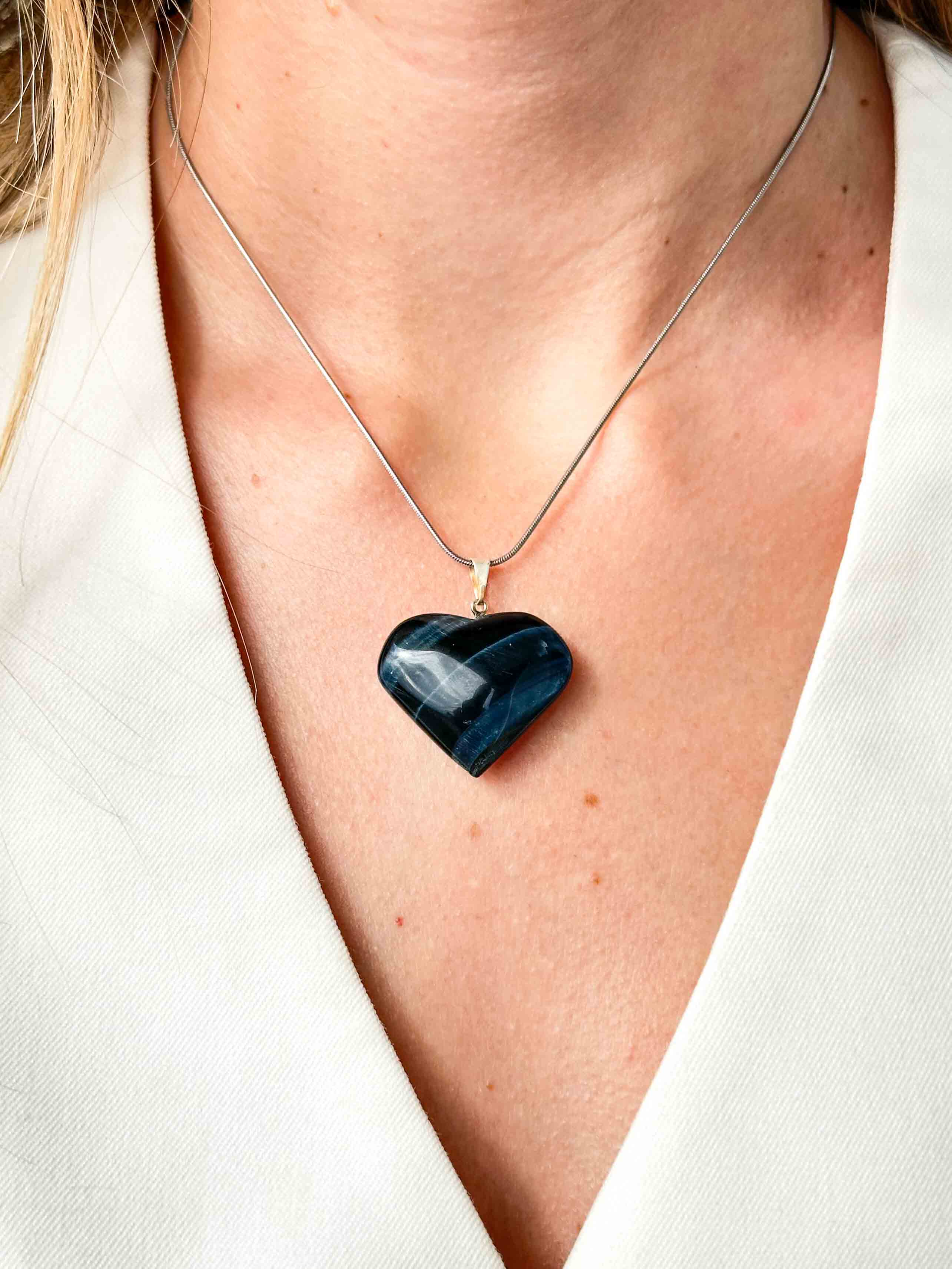 Ένα δυνατό φυλαχτό που συνδυάζει κομψότητα και προστασία. Το μπλε Μάτι της Τίγρης φέρνει πνευματική διαύγεια, γείωση και αυτοπεποίθηση, βοηθώντας να ξεπερνάμε το άγχος και να βλέπουμε τα πράγματα με καθαρότητα. Σκαλισμένο σε σχήμα καρδιάς, το μενταγιόν εκπέμπει αγάπη και εσωτερική δύναμη. Συνοδεύεται από την αλυσίδα του, έτοιμο να φορεθεί ή να χαριστεί ως ξεχωριστό δώρο.