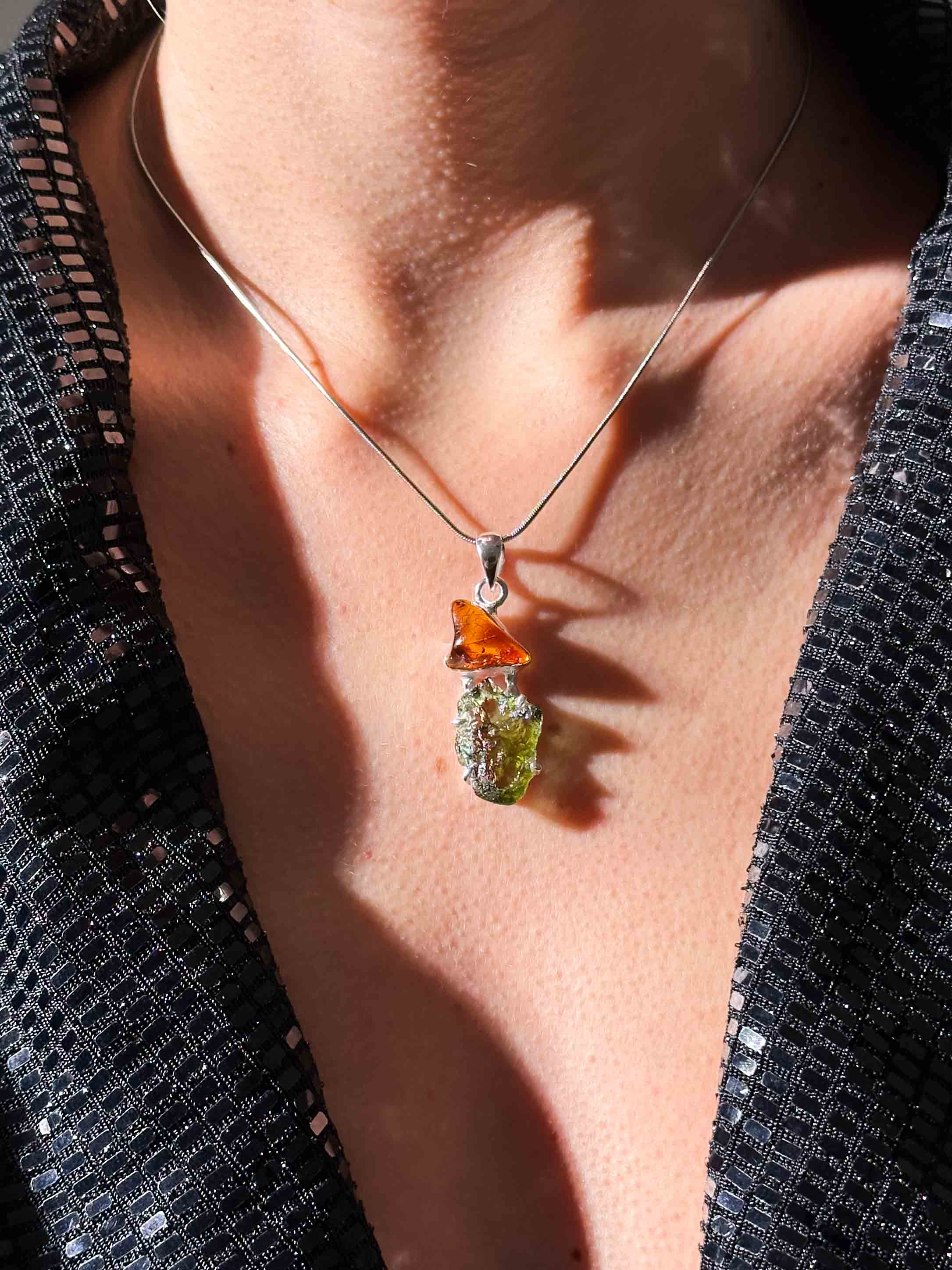 Όταν η κοσμική ενέργεια των άστρων συναντά την αρχαία σοφία των δέντρων. Αυτό το χειροποίητο μενταγιόν συνδυάζει την υψηλή δόνηση του πράσινου Μολδαβίτη με τη θερμή, θεραπευτική ενέργεια του Κεχριμπαριού Βαλτικής, δεμένα σε κομψό Ασήμι 925.