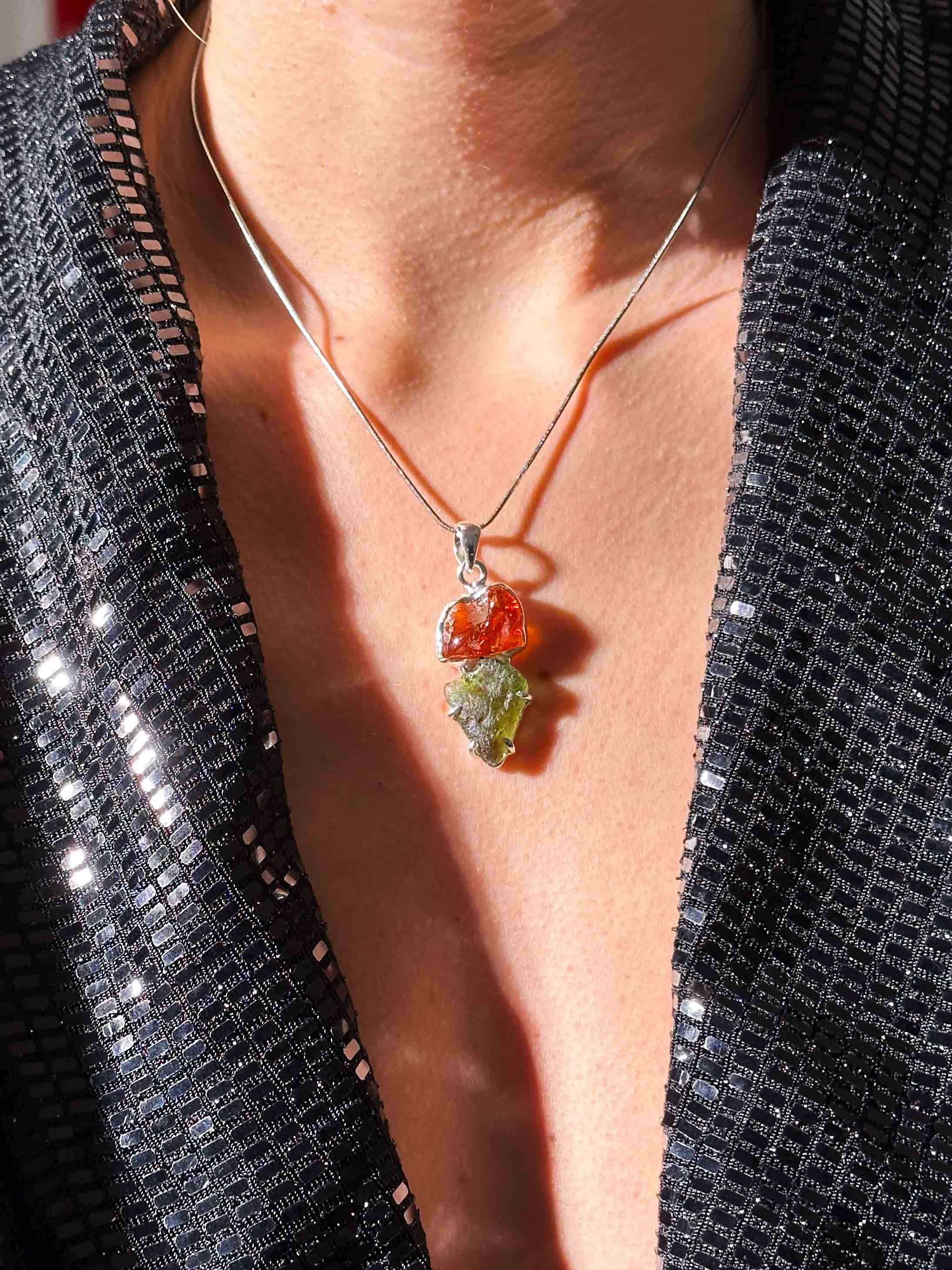 • Κάθε κομμάτι είναι μοναδικό, καθώς τόσο ο ακατέργαστος Μολδαβίτης όσο και το φυσικό Κεχριμπάρι έχουν το δικό τους ξεχωριστό σχήμα.