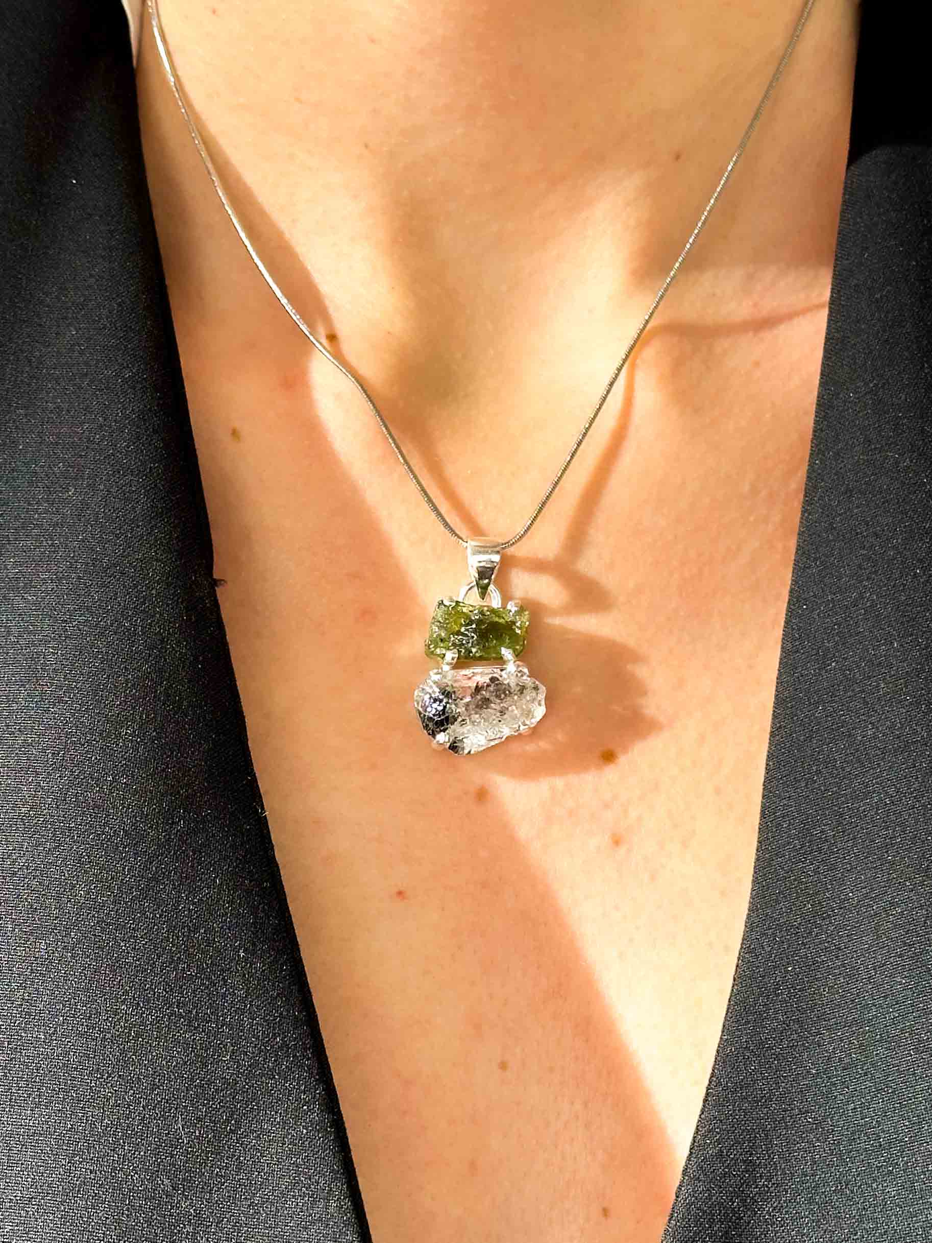 Αν ψάχνετε για ένα κόσμημα που δονείται σε ανώτερες συχνότητες, μόλις το βρήκατε. Αυτό το μενταγιόν ενώνει τον εξωγήινο Μολδαβίτη με τον πιο λαμπερό χαλαζία της Γης, το Διαμάντι Herkimer, σε ένα αριστοτεχνικό δέσιμο από Ασήμι 925.