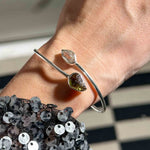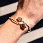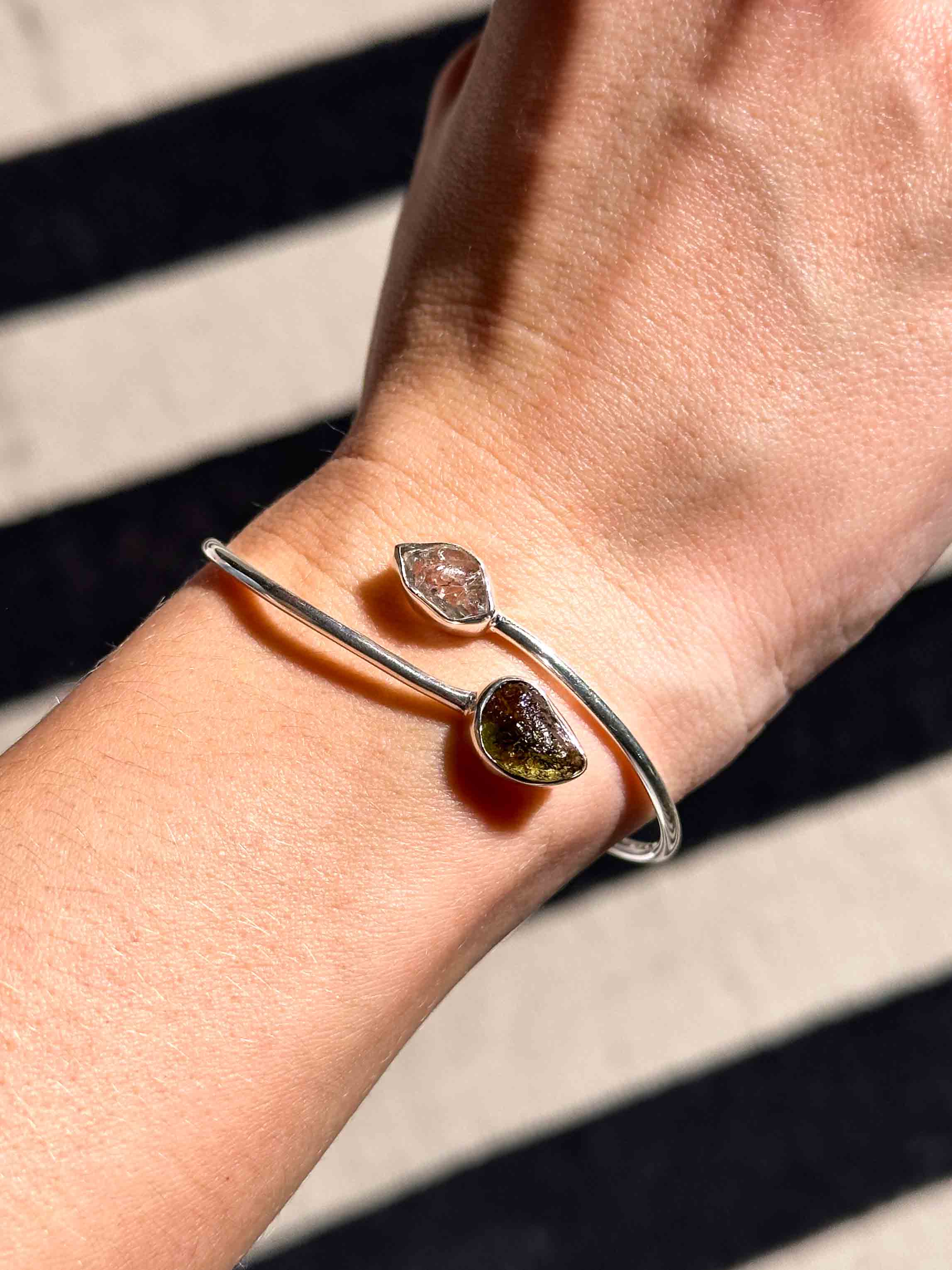 Ένα κόσμημα υψηλής δόνησης για όσους αναζητούν ραγδαία πνευματική εξέλιξη. Αυτό το χειροποίητο βραχιόλι (cuff) από μασίφ Ασήμι 925 ενώνει τον «λίθο των άστρων», τον Μολδαβίτη, με τον πιο δυνατό ενισχυτή του ορυκτού βασιλείου, το Διαμάντι Herkimer.