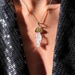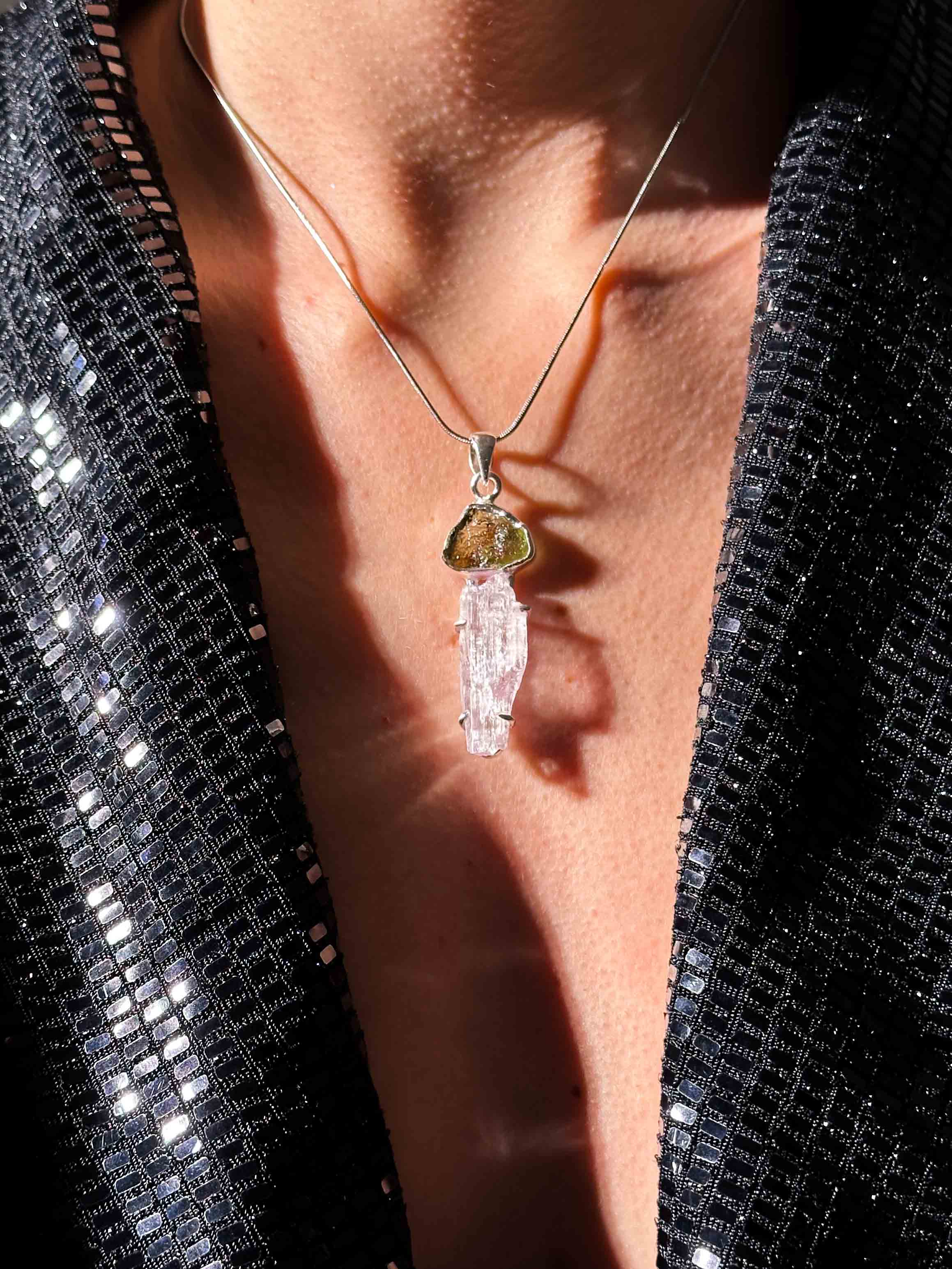 Ένα κόσμημα αφιερωμένο στην αγάπη και την πνευματική ανύψωση. Αυτό το μενταγιόν συνδυάζει την κοσμική δύναμη του πράσινου Μολδαβίτη με την τρυφερή, θεϊκή ενέργεια του ροζ Κουνζίτη, δεμένα αριστοτεχνικά σε Ασήμι 925.