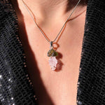 Ένα κόσμημα αφιερωμένο στην αγάπη και την πνευματική ανύψωση. Αυτό το μενταγιόν συνδυάζει την κοσμική δύναμη του πράσινου Μολδαβίτη με την τρυφερή, θεϊκή ενέργεια του ροζ Κουνζίτη, δεμένα αριστοτεχνικά σε Ασήμι 925.