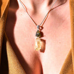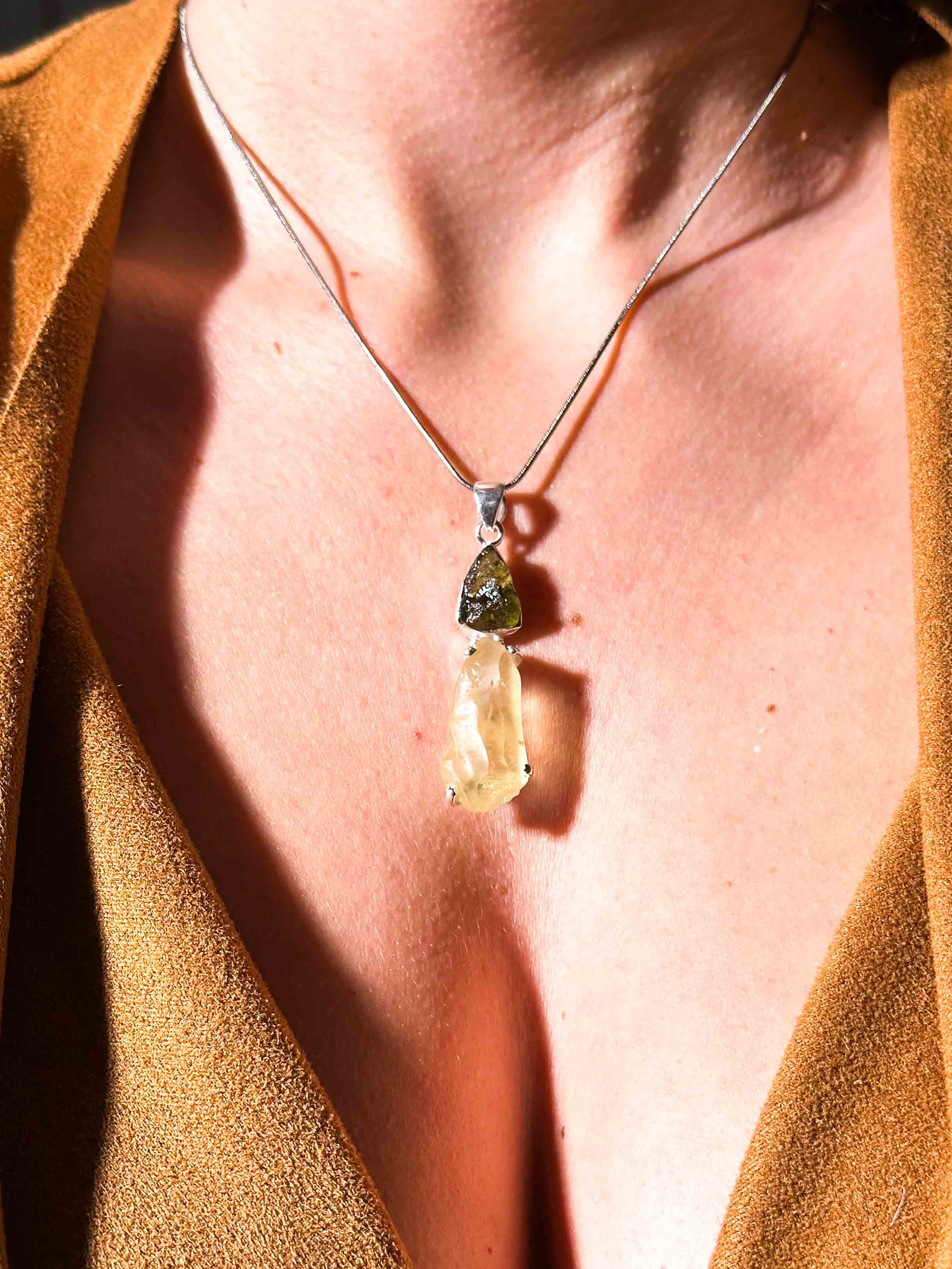 Ένα κόσμημα σπάνιας ομορφιάς και δόνησης. Αυτό το διπλό μενταγιόν ενώνει δύο «αδελφές» πέτρες που γεννήθηκαν από τα άστρα: τον Μολδαβίτη από την Τσεχία και το Γυαλί της Λιβυκής Ερήμου από την Αίγυπτο/Λιβύη, δεμένα κομψά σε Ασήμι 925.