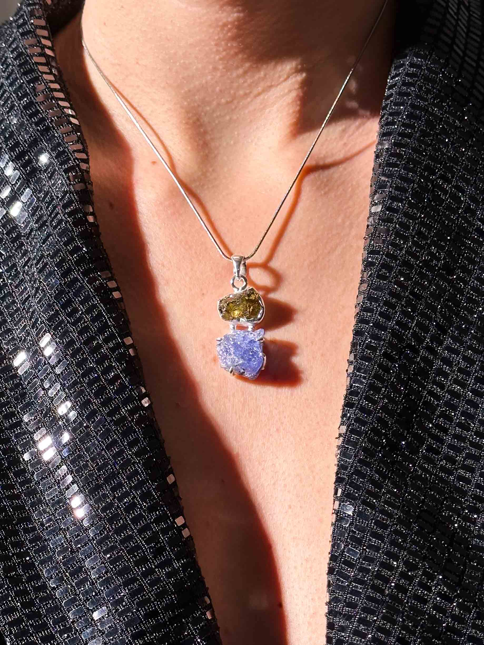 Η συνάντηση δύο γιγάντων. Ένα σπάνιο συλλεκτικό κόσμημα που παντρεύει την εξωγήινη ενέργεια του Μολδαβίτη με τη μυστικιστική αύρα του Ακατέργαστου Τανζανίτη, δεμένα σε Ασήμι 925.