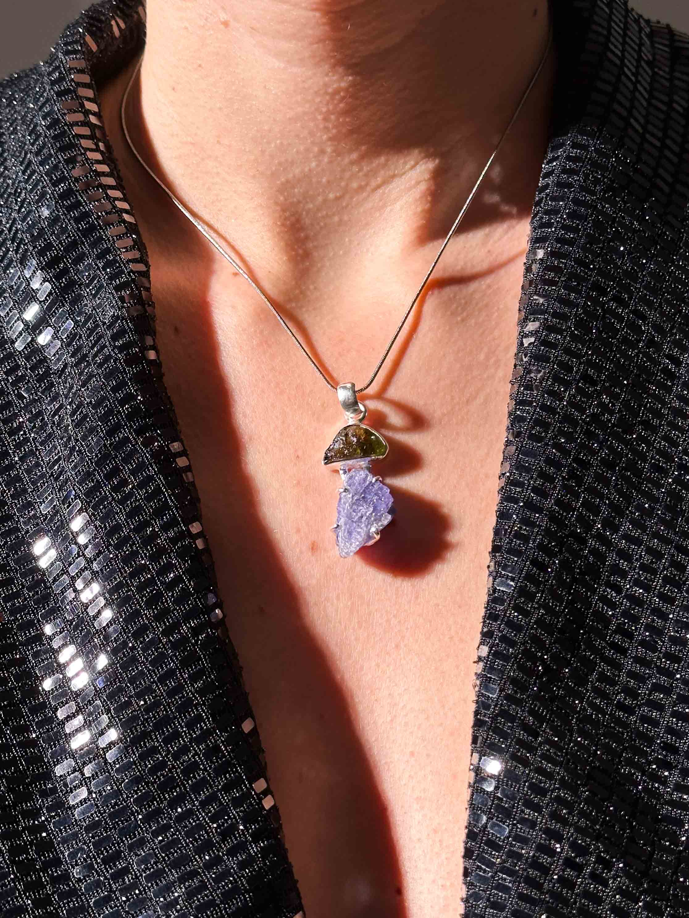 Η συνάντηση δύο γιγάντων. Ένα σπάνιο συλλεκτικό κόσμημα που παντρεύει την εξωγήινη ενέργεια του Μολδαβίτη με τη μυστικιστική αύρα του Ακατέργαστου Τανζανίτη, δεμένα σε Ασήμι 925.