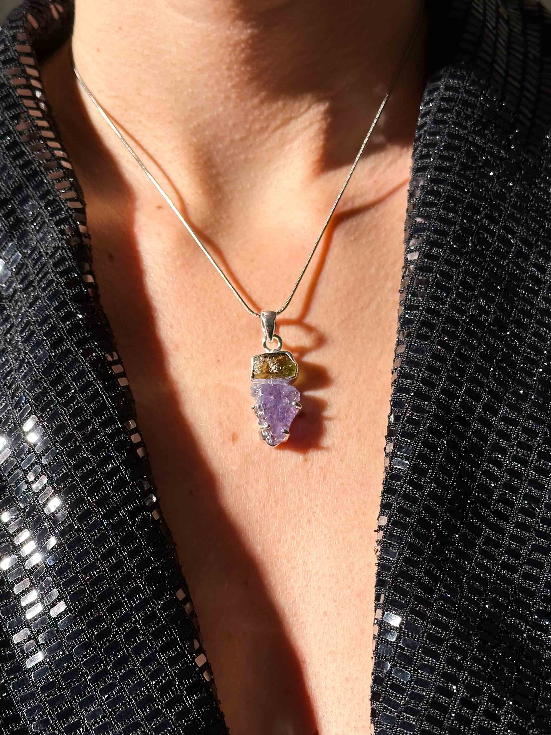 Η συνάντηση δύο γιγάντων. Ένα σπάνιο συλλεκτικό κόσμημα που παντρεύει την εξωγήινη ενέργεια του Μολδαβίτη με τη μυστικιστική αύρα του Ακατέργαστου Τανζανίτη, δεμένα σε Ασήμι 925.