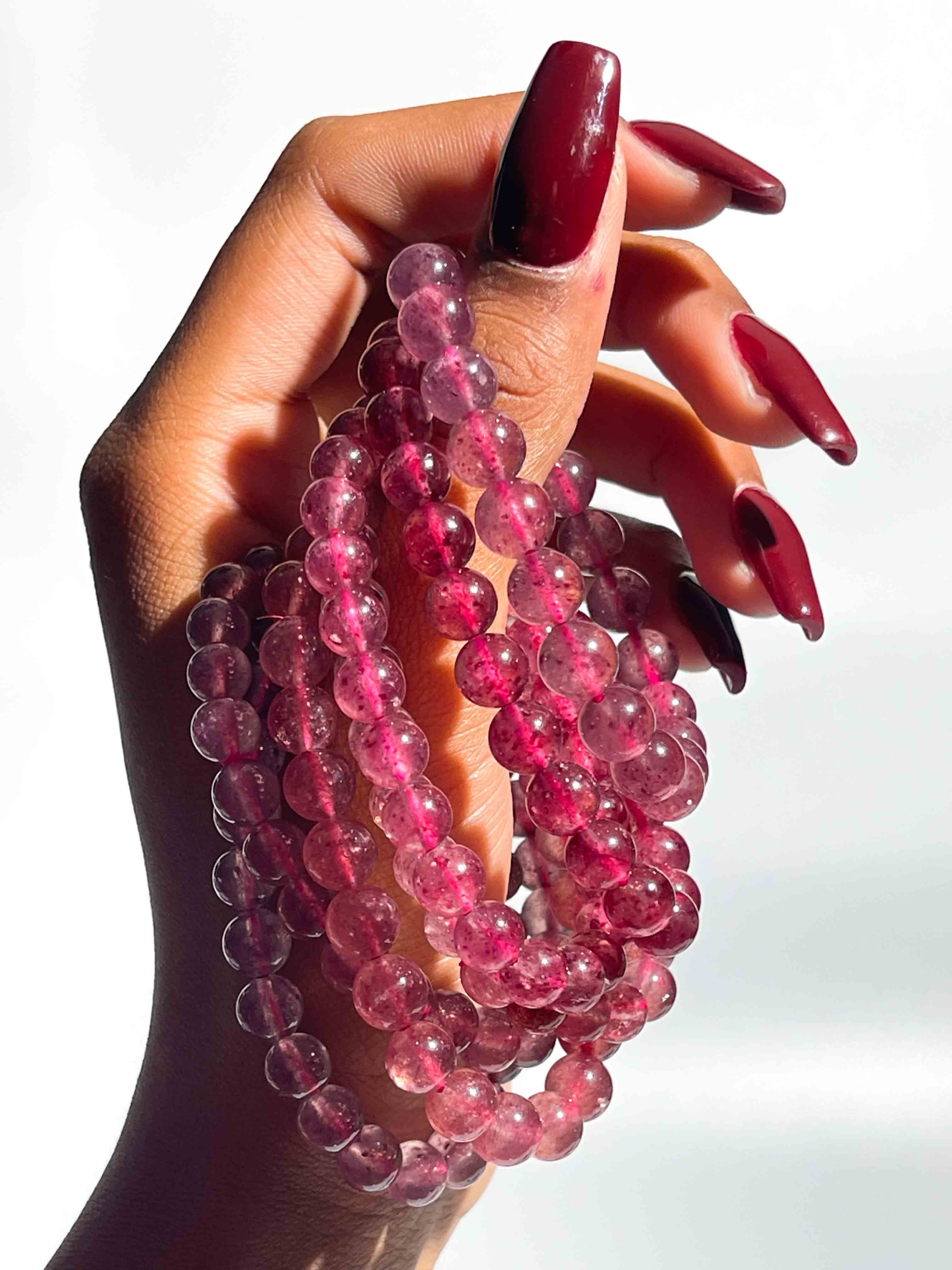 Ο Χαλαζίας Φράουλα είναι κατά κύριο λόγο μια πέτρα χαράς. Μας δίνει τη δυνατότητα να δούμε τις χαρούμενες, όμορφες και ευχάριστες πτυχές της Ζωής. Αυξάνει την αισιοδοξία και τη θετική σκέψη. Εάν έχετε κολλήσει σε ένα κύμα αρνητικότητας, απαισιοδοξίας το Strawberry Quartz σας βοηθά να μεταμορφώσετε αυτά τα συναισθήματα σε πιο αναζωογονητικά και υποστηρικτικά συναισθήματα. Εάν η καθημερινότητά σας είναι στάσιμη και βαρετή, τότε αυτή η πέτρα σας βοηθά να αναγνωρίσετε τις απλές απολαύσεις που σας έκαναν ευτυχισμένους.