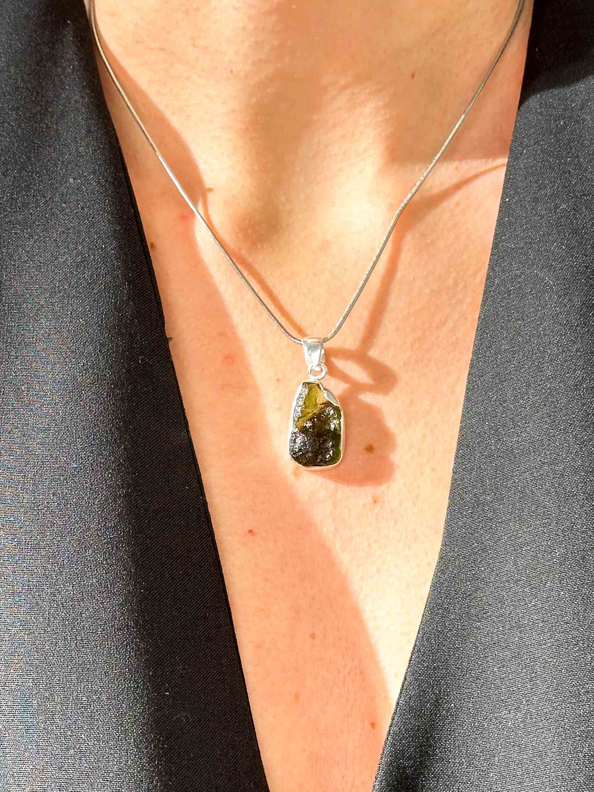 Ανακαλύψτε τη γήινη γοητεία και την κοσμική ενέργεια με αυτό το μοναδικό μενταγιόν Μολδαβίτη. Το κόσμημα διαθέτει έναν αυθεντικό, ακατέργαστο λίθο Μολδαβίτη, με την χαρακτηριστική ανάγλυφη υφή και το βαθύ πράσινο χρώμα του, δεμένο προσεκτικά σε Ασήμι 925 (Sterling Silver). Το λιτό και κομψό ασημένιο δέσιμο αναδεικνύει τη φυσική ομορφιά του λίθου, επιτρέποντας στο φως να διαπερνά την ημιδιαφανή δομή του.