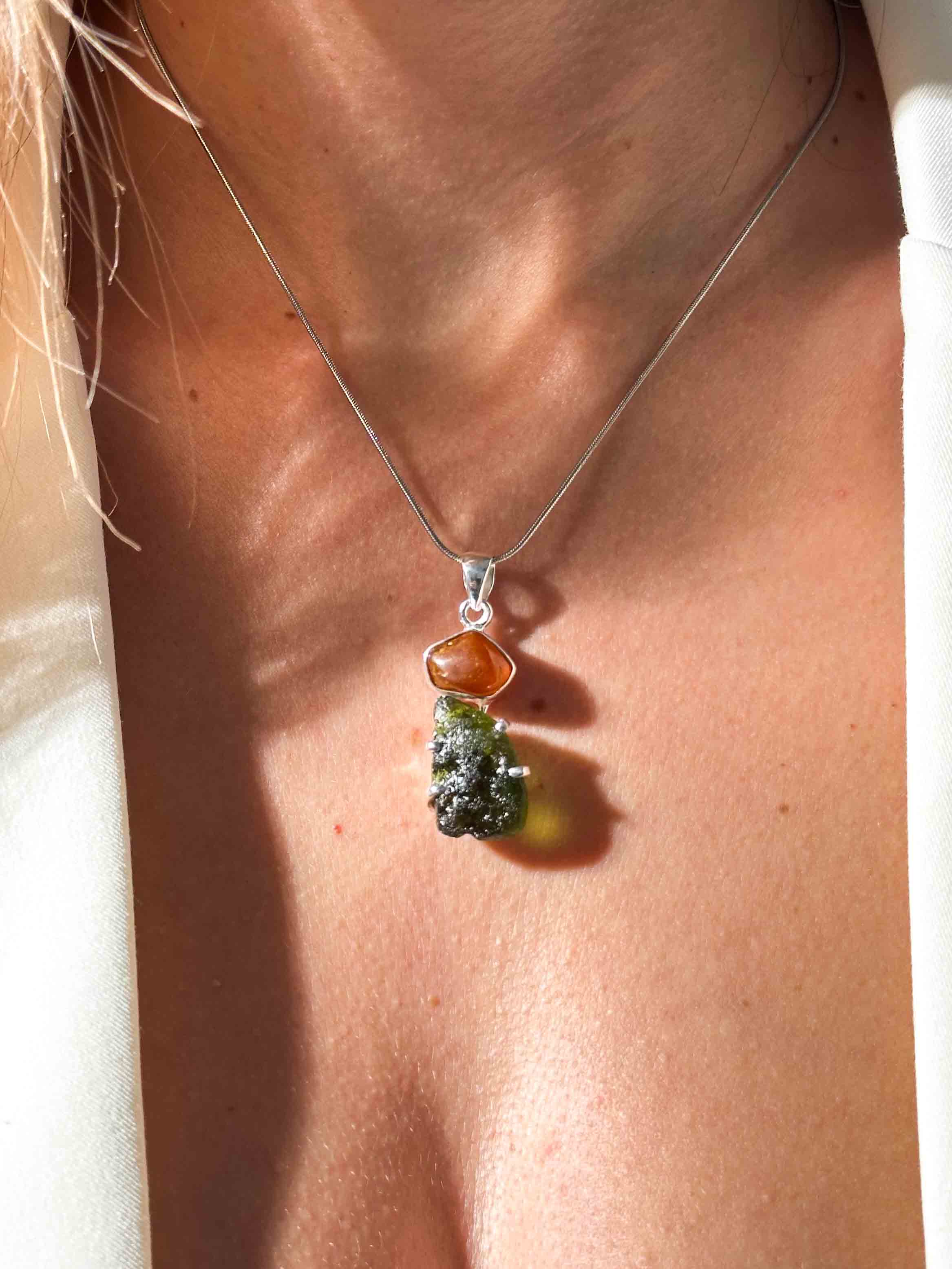 Ένα μενταγιόν που συνδυάζει τη γήινη ζεστασιά του Βαλτικού Κεχριμπαριού με τη μεταμορφωτική δύναμη του Μολδαβίτη, δημιουργώντας ένα φυλαχτό που εξισορροπεί και ανυψώνει.