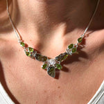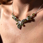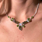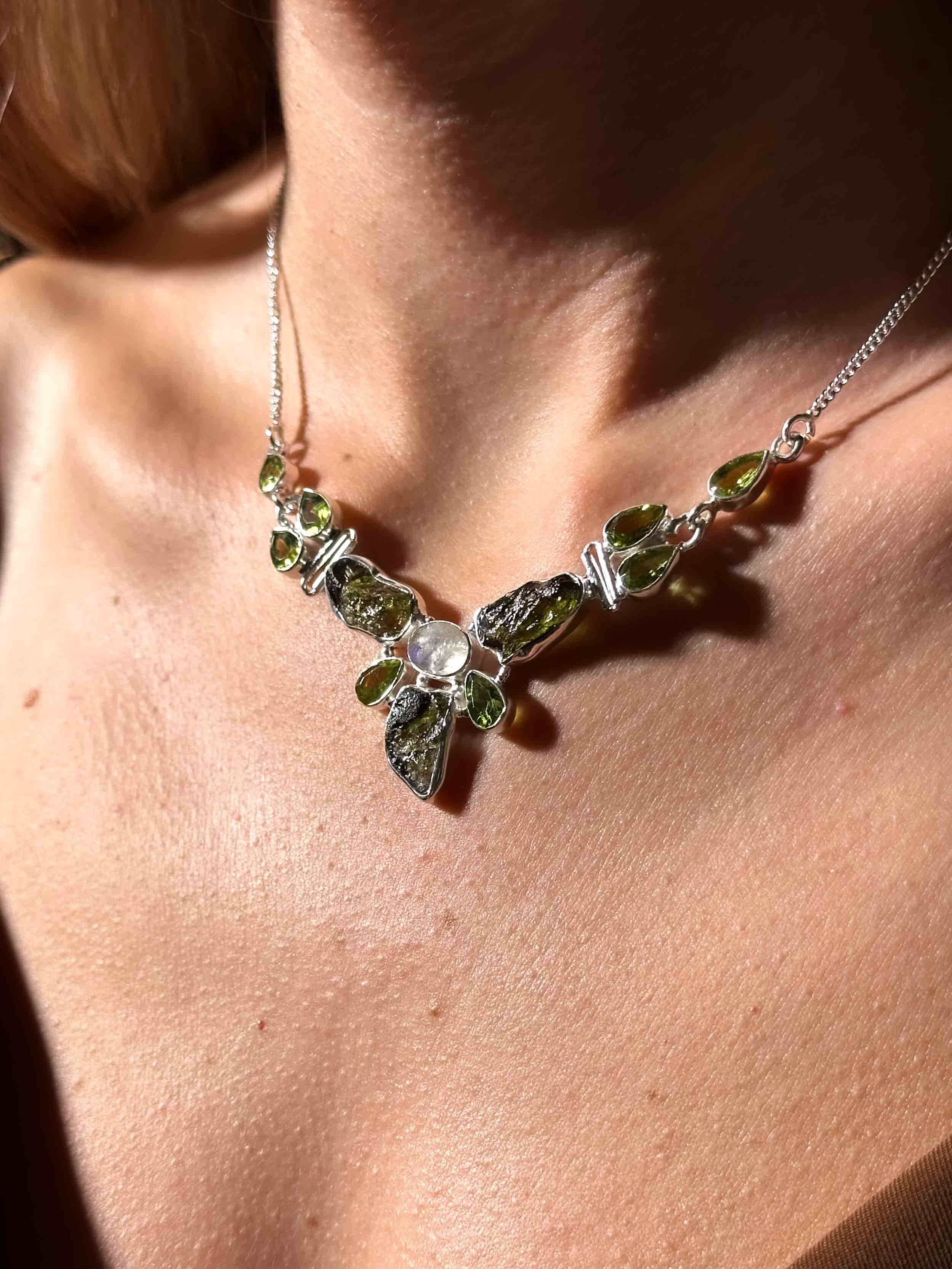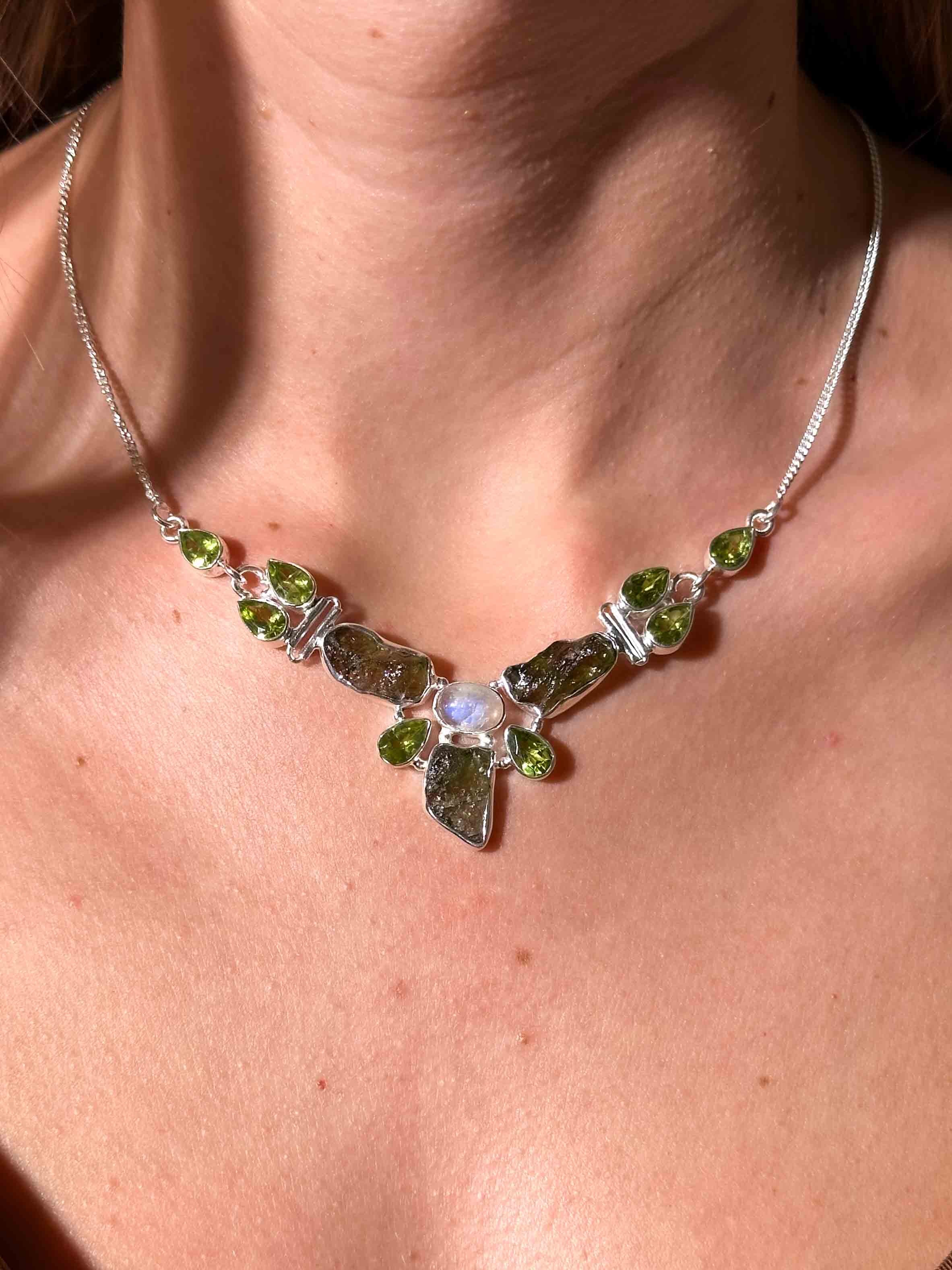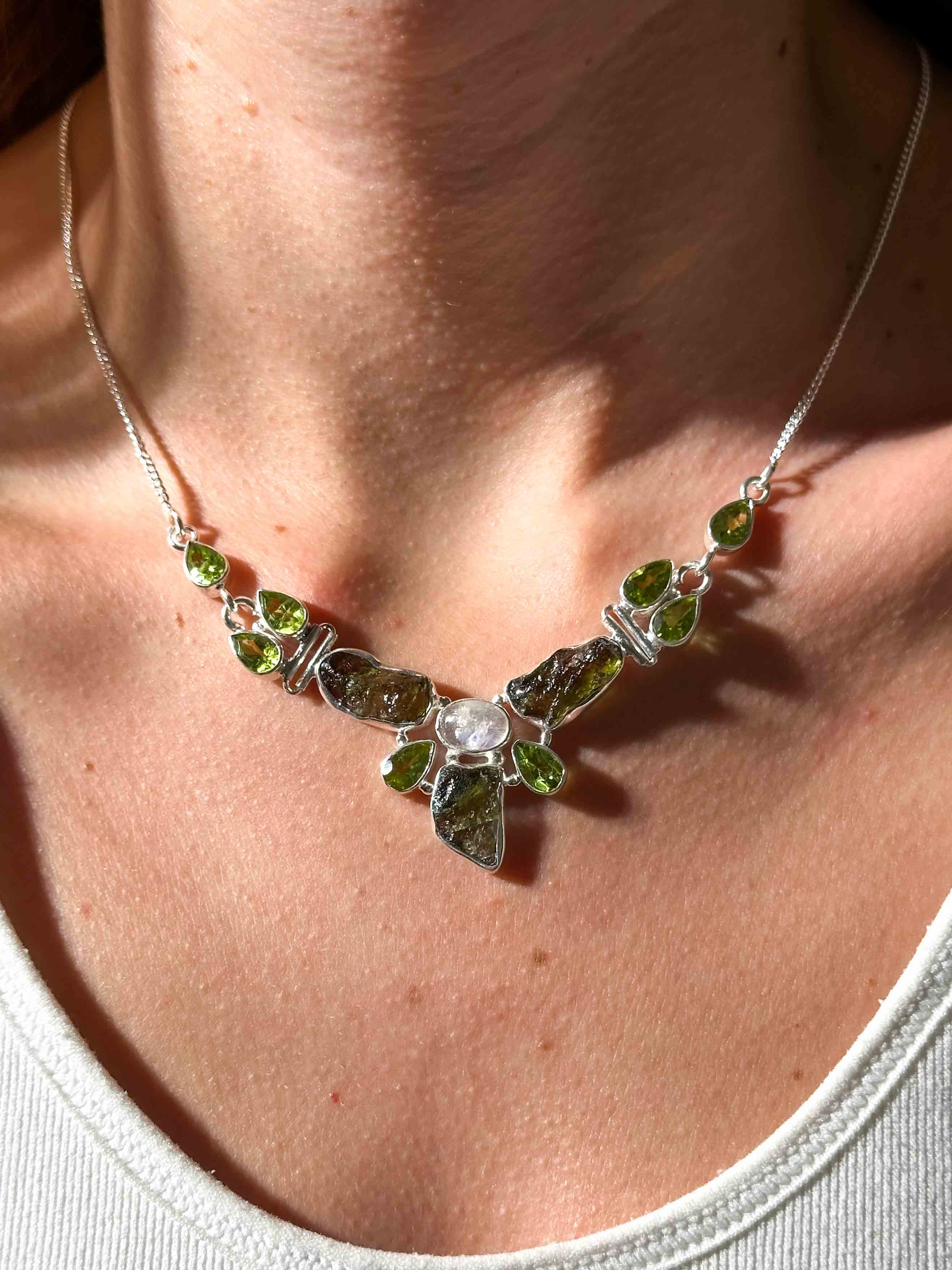 Κολιέ με Μολδαβίτη, Φεγγαρόπετρα Rainbow & Περιδότο σε Ασήμι 925