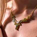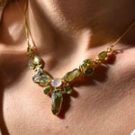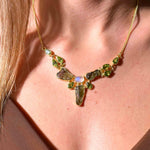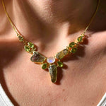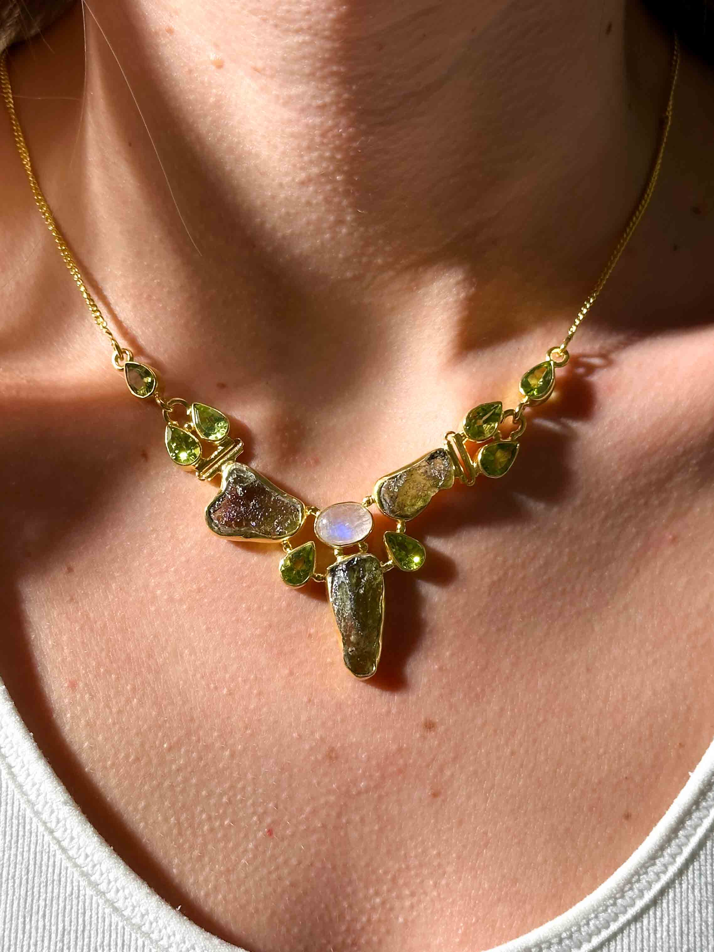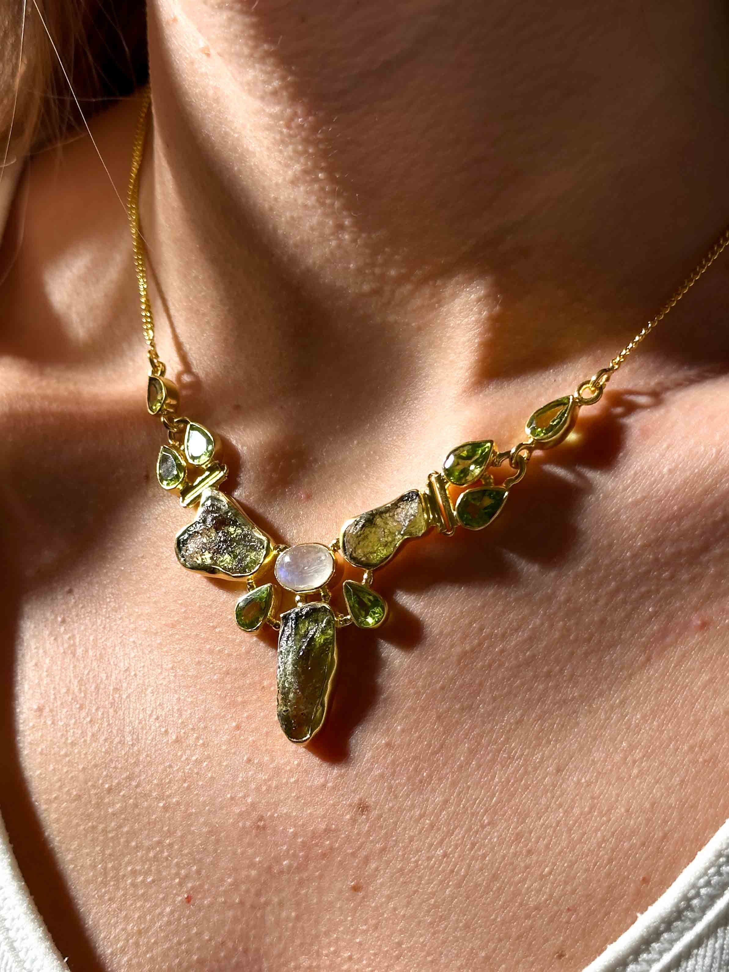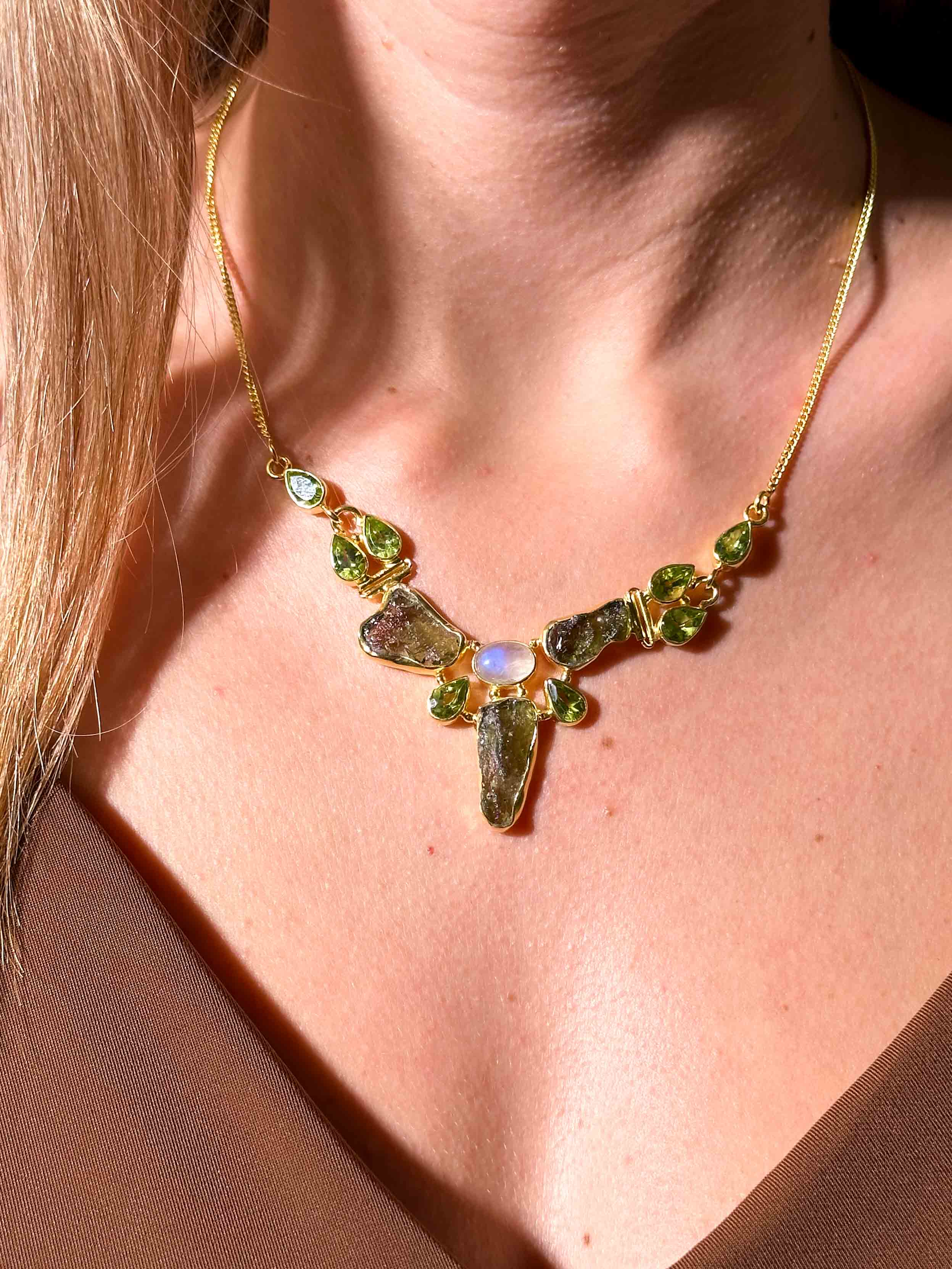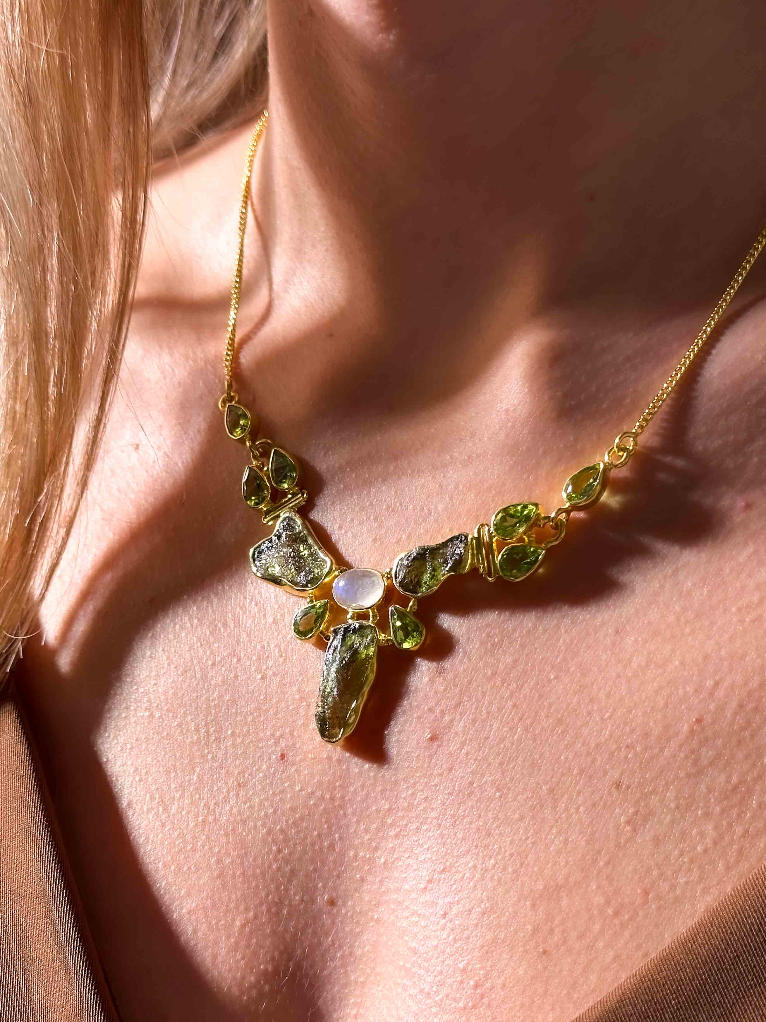Κολιέ με Μολδαβίτη, Φεγγαρόπετρα Rainbow & Περιδότο σε Ασήμι 925 επιχρυσωμένο 24Κ