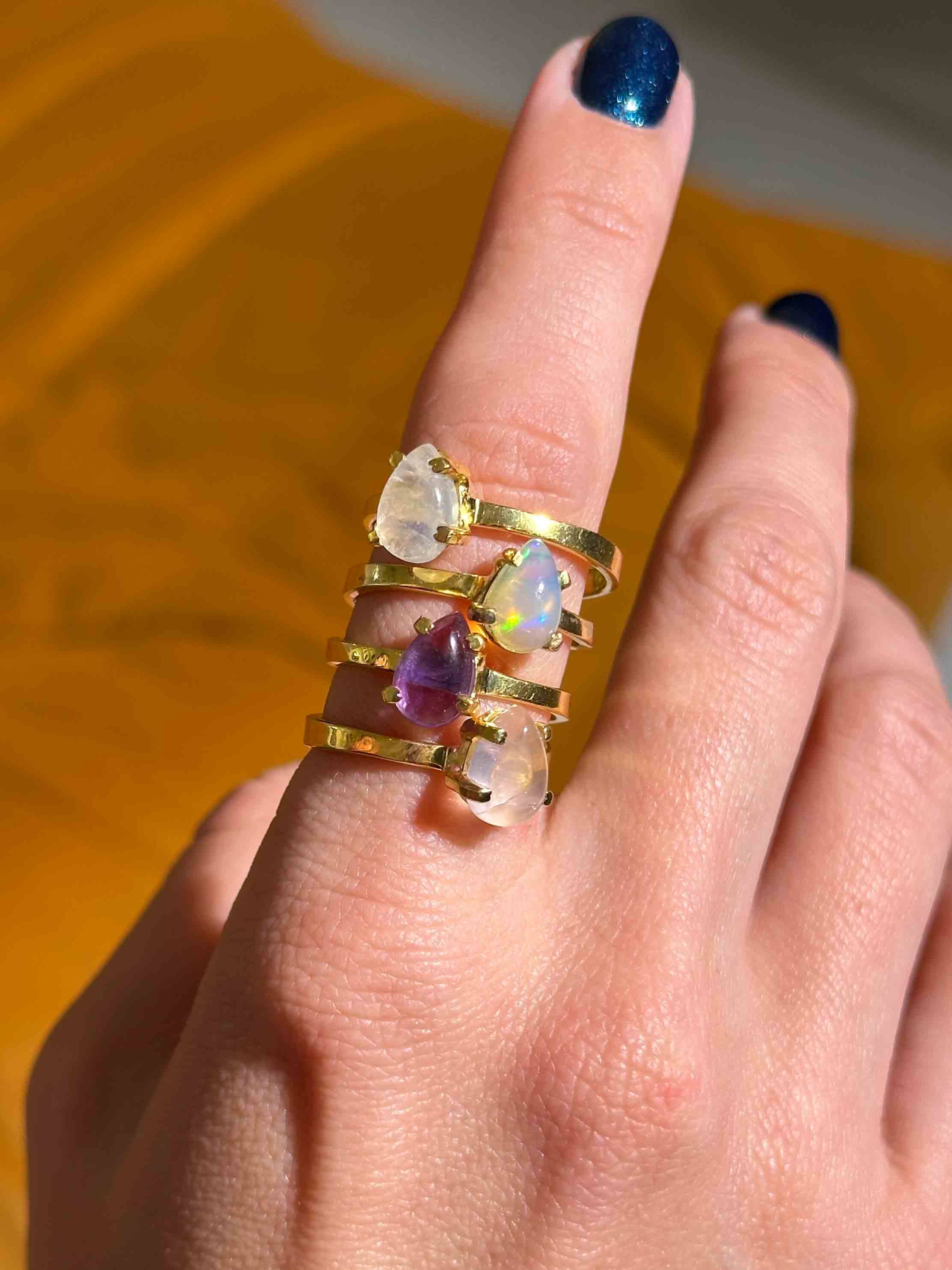 Ένα δαχτυλίδι που ακτινοβολεί πνευματική καθαρότητα και ηρεμία. Ο Αμέθυστος σε σχήμα δάκρυ, δεμένος σε ασήμι 925 επιχρυσωμένο 24Κ, ενισχύει τη διαύγεια, την αυτογνωσία και τη σύνδεση με ανώτερα πεδία συνείδησης. Ρυθμιζόμενο σε μέγεθος, γίνεται το προσωπικό σου φυλαχτό για εσωτερική ισορροπία και πνευματική ενέργεια.