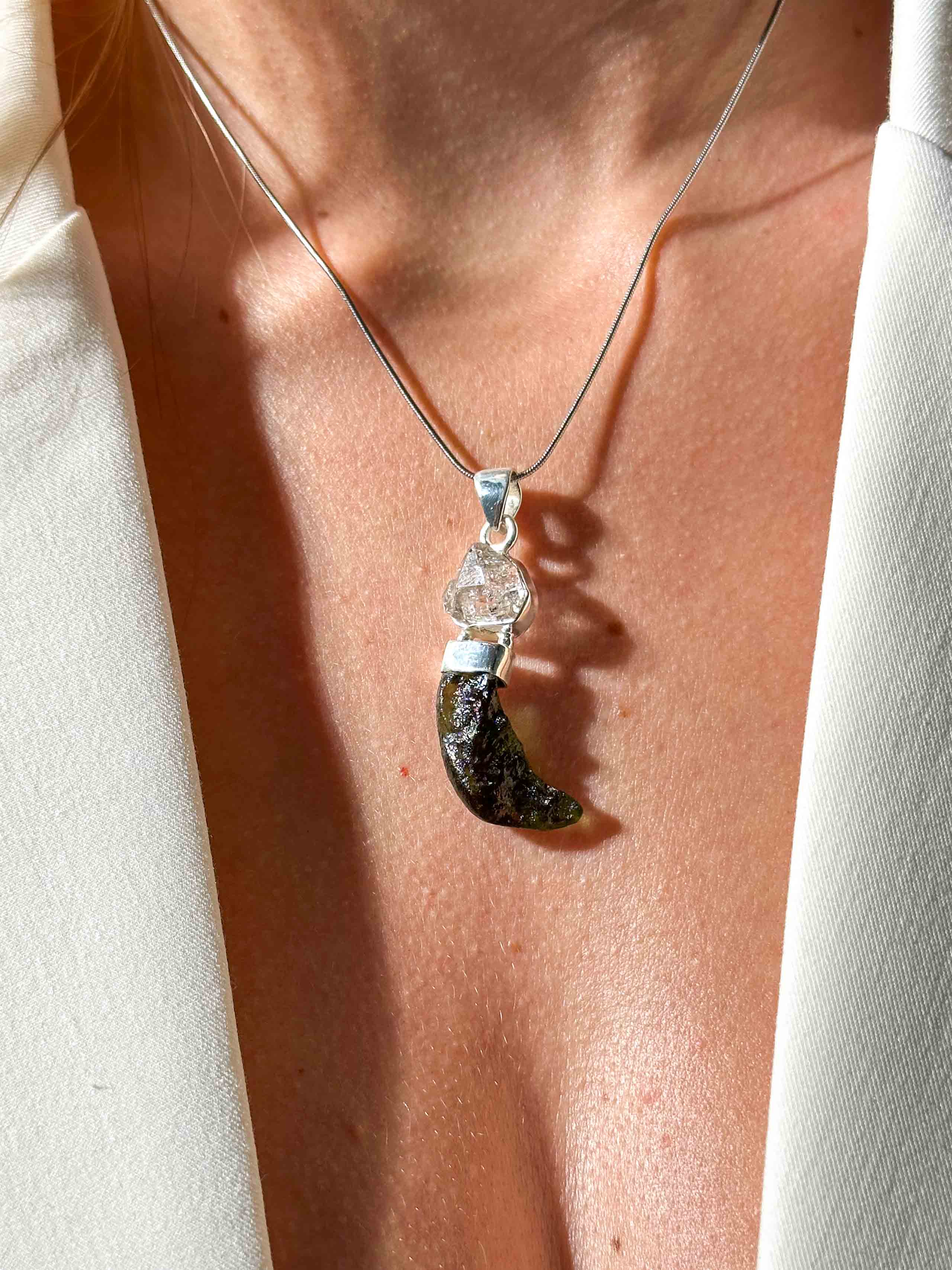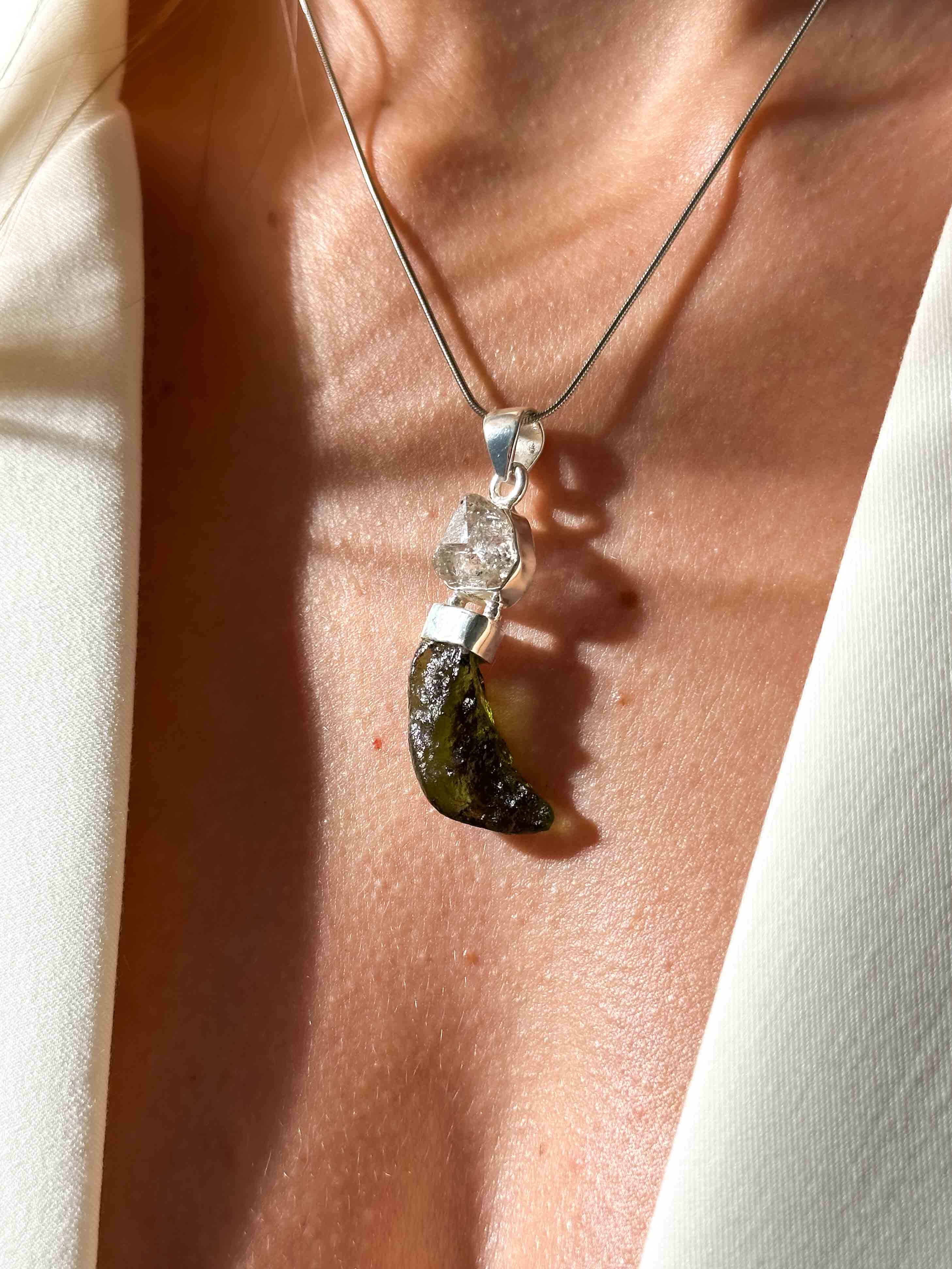 Το μενταγιόν μας με Μολδαβίτη και Ηerkimer Diamond είναι ένα ξεχωριστό κόσμημα με έντονη ενεργειακή δύναμη. Ο σπάνιος Μολδαβίτης, που σχηματίστηκε πριν από 15 εκατομμύρια χρόνια από πτώση μετεωρίτη στην Τσεχία, ξεχωρίζει με το πράσινο χρώμα του και την μοναδική, μεταμορφωτική του ενέργεια. Το Ηerkimer Diamond, γνωστό για τη δόνησή του υψηλής συχνότητας, φέρνει ισορροπία και αρμονία, ενώ παράλληλα ενεργοποιεί και αφυπνίζει την εσωτερική πνευματική δύναμη του κατόχου του.