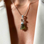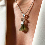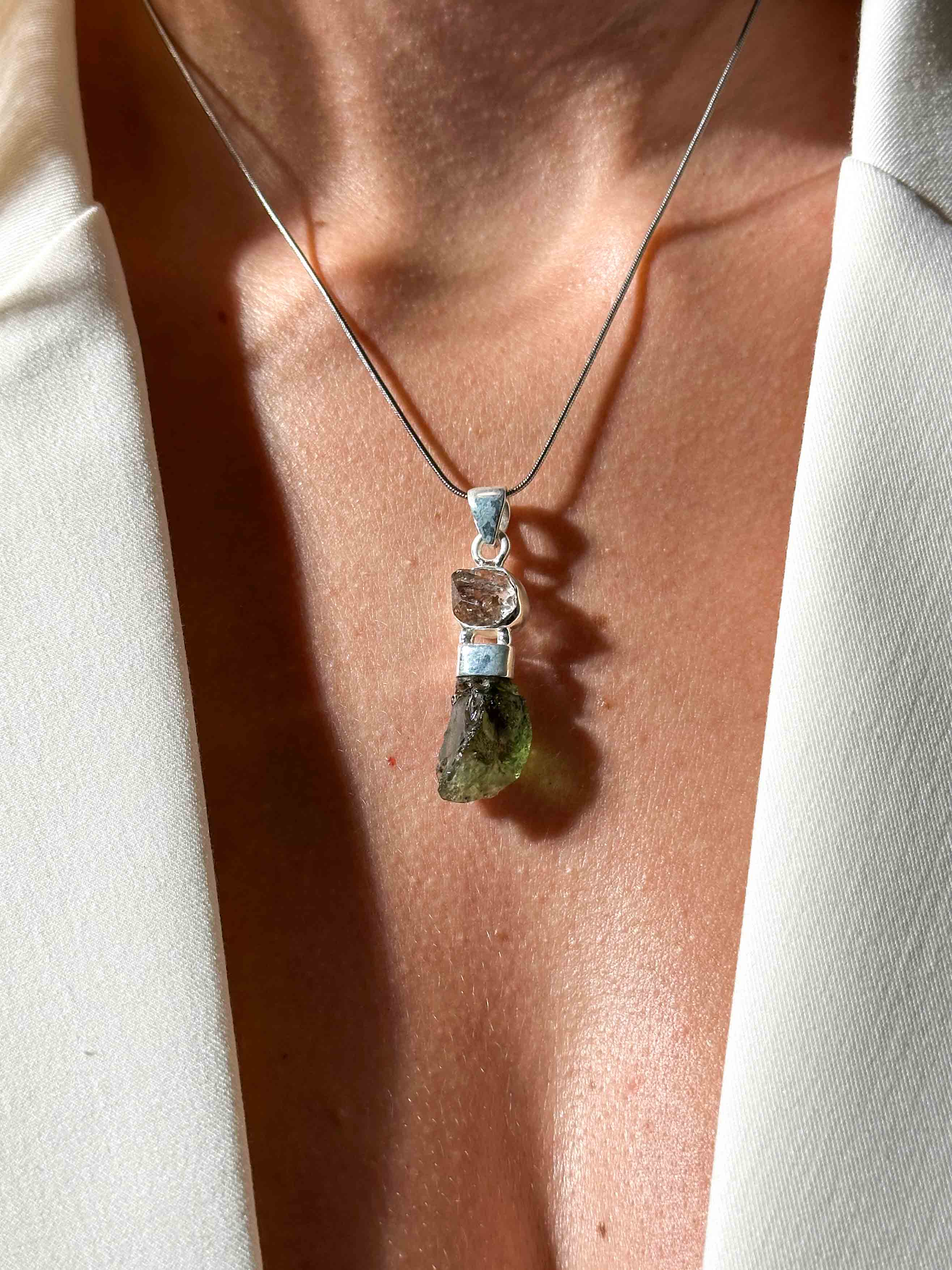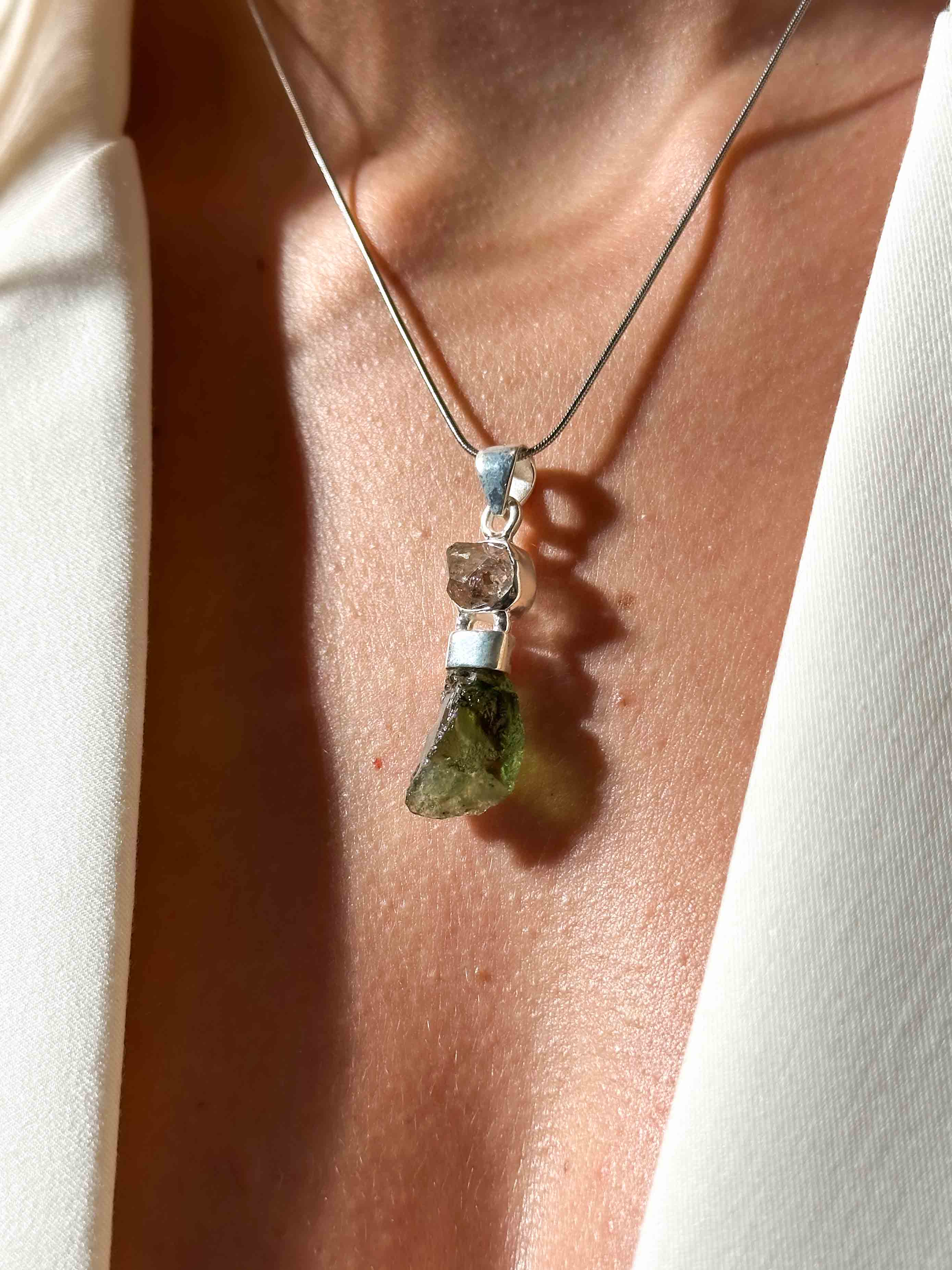 Το μενταγιόν μας με Μολδαβίτη και Ηerkimer Diamond είναι ένα ξεχωριστό κόσμημα με έντονη ενεργειακή δύναμη. Ο σπάνιος Μολδαβίτης, που σχηματίστηκε πριν από 15 εκατομμύρια χρόνια από πτώση μετεωρίτη στην Τσεχία, ξεχωρίζει με το πράσινο χρώμα του και την μοναδική, μεταμορφωτική του ενέργεια. Το Ηerkimer Diamond, γνωστό για τη δόνησή του υψηλής συχνότητας, φέρνει ισορροπία και αρμονία, ενώ παράλληλα ενεργοποιεί και αφυπνίζει την εσωτερική πνευματική δύναμη του κατόχου του.