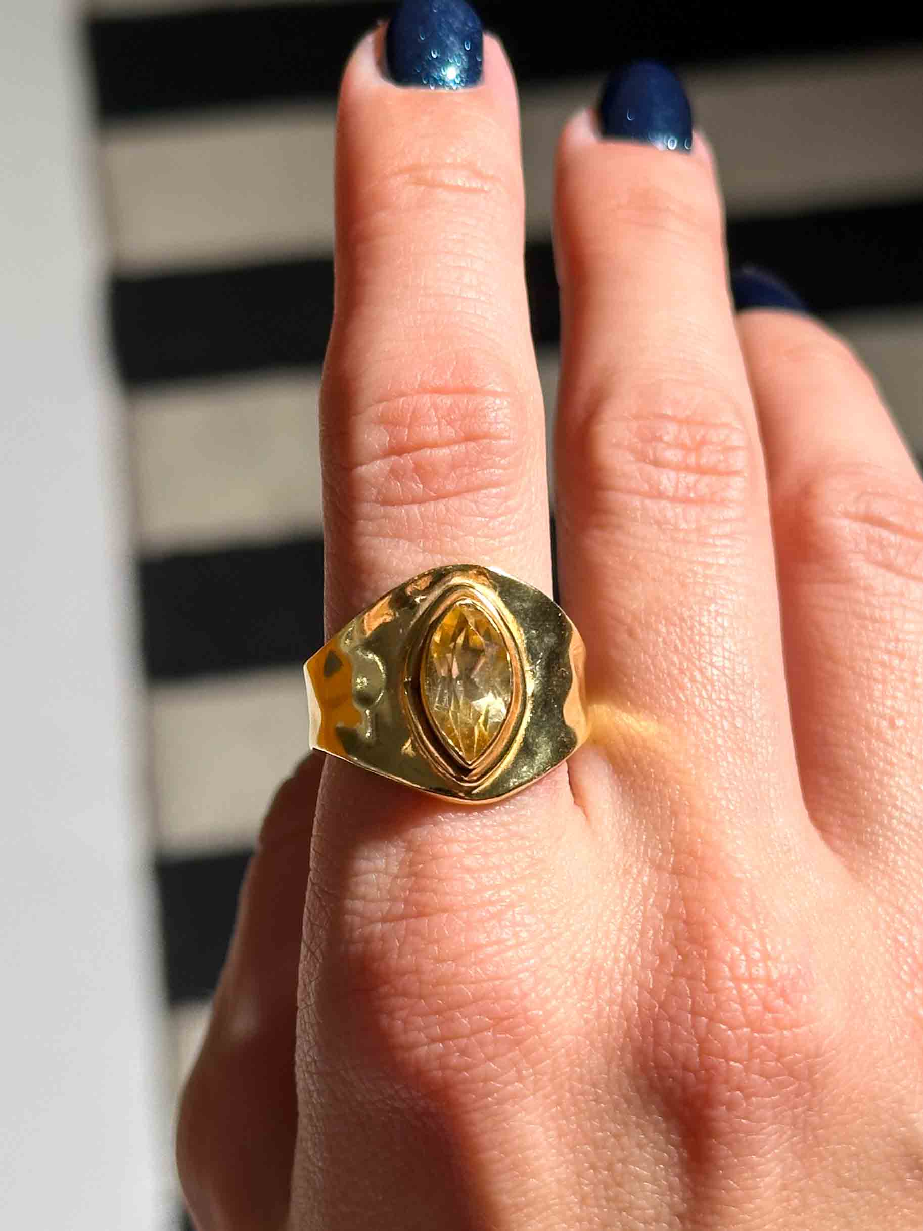 Ένα δαχτυλίδι γεμάτο φως και ενέργεια ευημερίας. Ο Κιτρίνης σε κοπή Marquise, δεμένος σε επιχρυσωμένο ασήμι 925 και ρυθμιζόμενη σε μέγεθος, ακτινοβολεί χαρά, δημιουργικότητα και αισιοδοξία. Κάθε λεπτομέρεια του κοσμήματος θυμίζει ότι η αφθονία και η θετική ενέργεια μπορούν να φορεθούν.