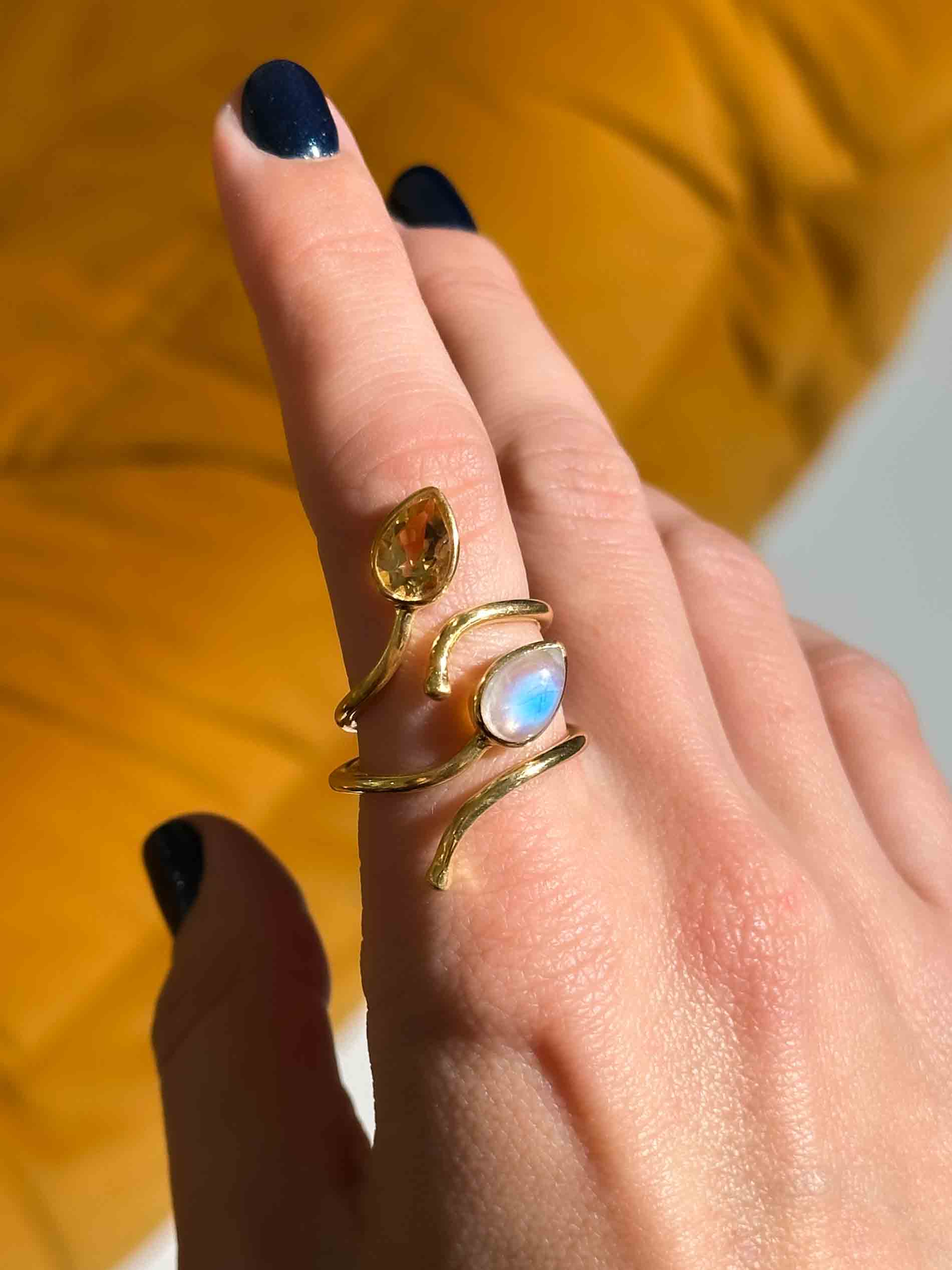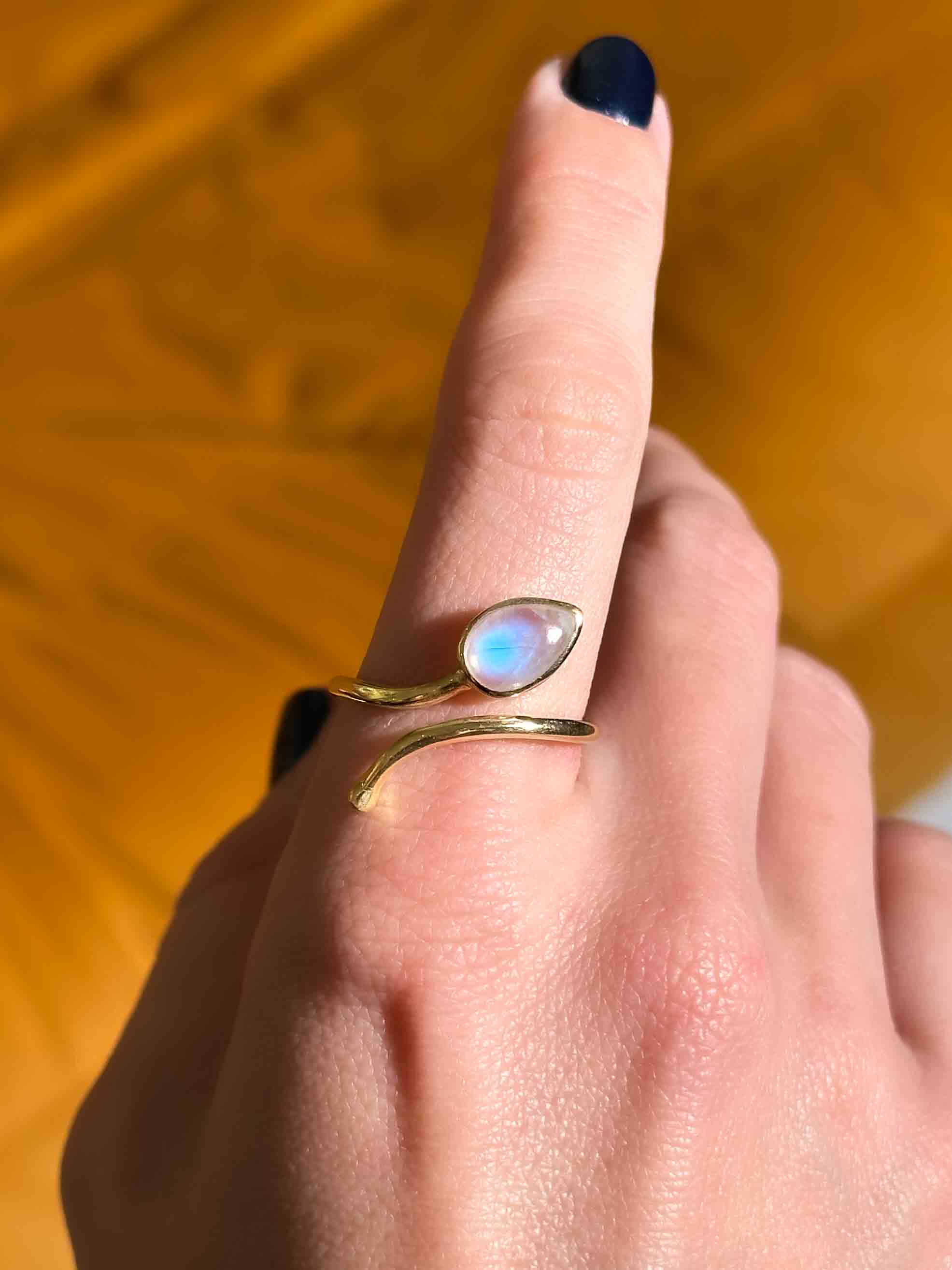 Ένα δαχτυλίδι που αιχμαλωτίζει το φως και τη μαγεία του φεγγαρόφωτος. Η Rainbow Φεγγαρόπετρα σε σχήμα Drop, δεμένη σε επιχρυσωμένο ασήμι 24Κ, ανακλά χρώματα με κάθε κίνηση, σαν να κρατάς στα χέρια σου ένα κομμάτι σελήνης. Ρυθμιζόμενο σε μέγεθος, συνδυάζει κομψότητα και πνευματική ενέργεια, δημιουργώντας ένα κόσμημα που μαγνητίζει τα βλέμματα.