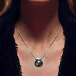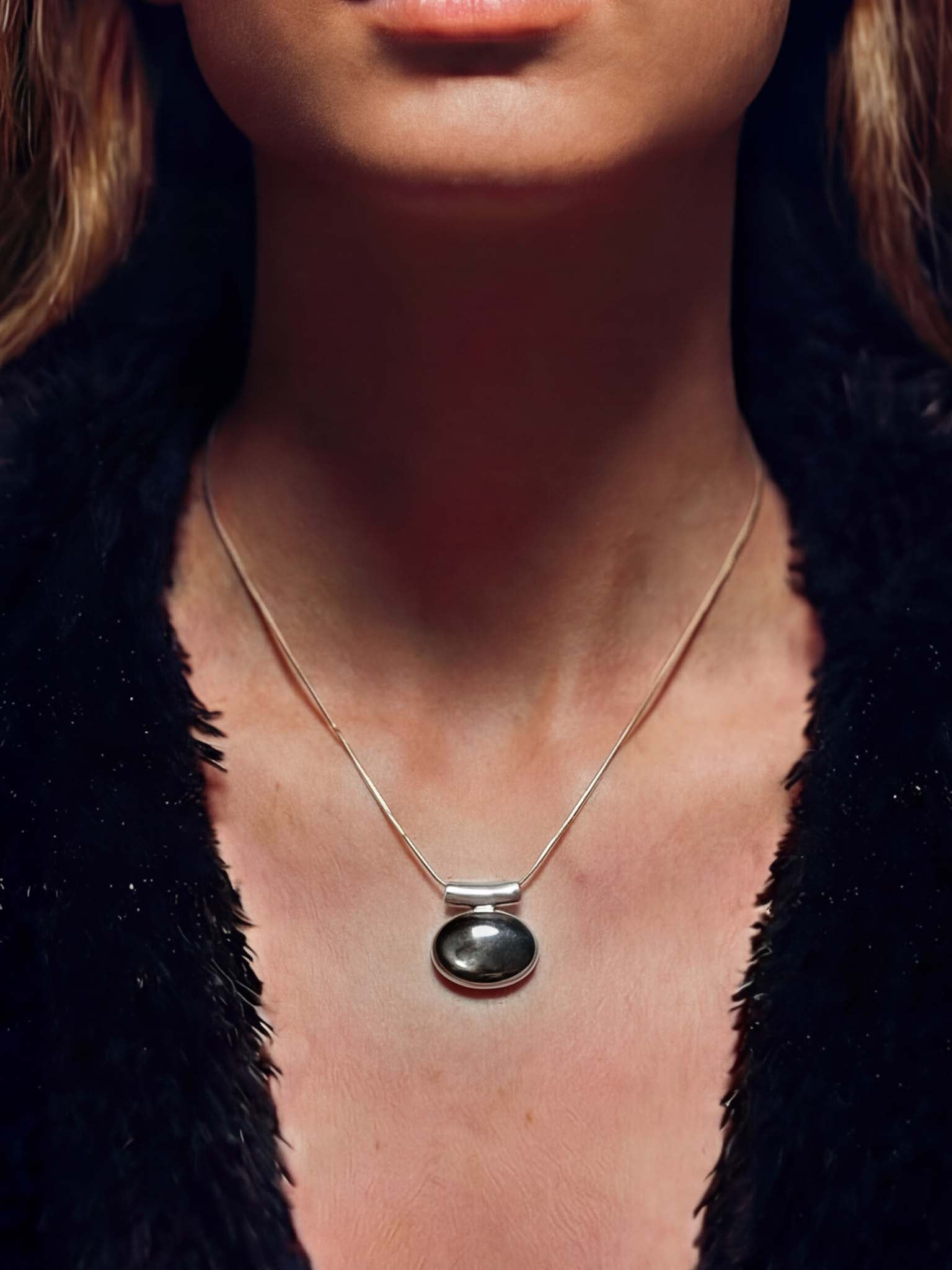 Ο υπερσθένης, γνωστός και ως "η πέτρα του βελούδου", μαγνητίζει τα βλέμματα χάρη στους σκούρους τόνους του που αναδίδουν μοναδικές, ιριδίζουσες μεταλλικές αντανακλάσεις στο φως. Το κόσμημα συνοδεύεται από μια κομψή και εξαιρετικά ανθεκτική ατσάλινη αλυσίδα, έτοιμο να φορεθεί ή να προσφερθεί ως ένα ξεχωριστό δώρο.
