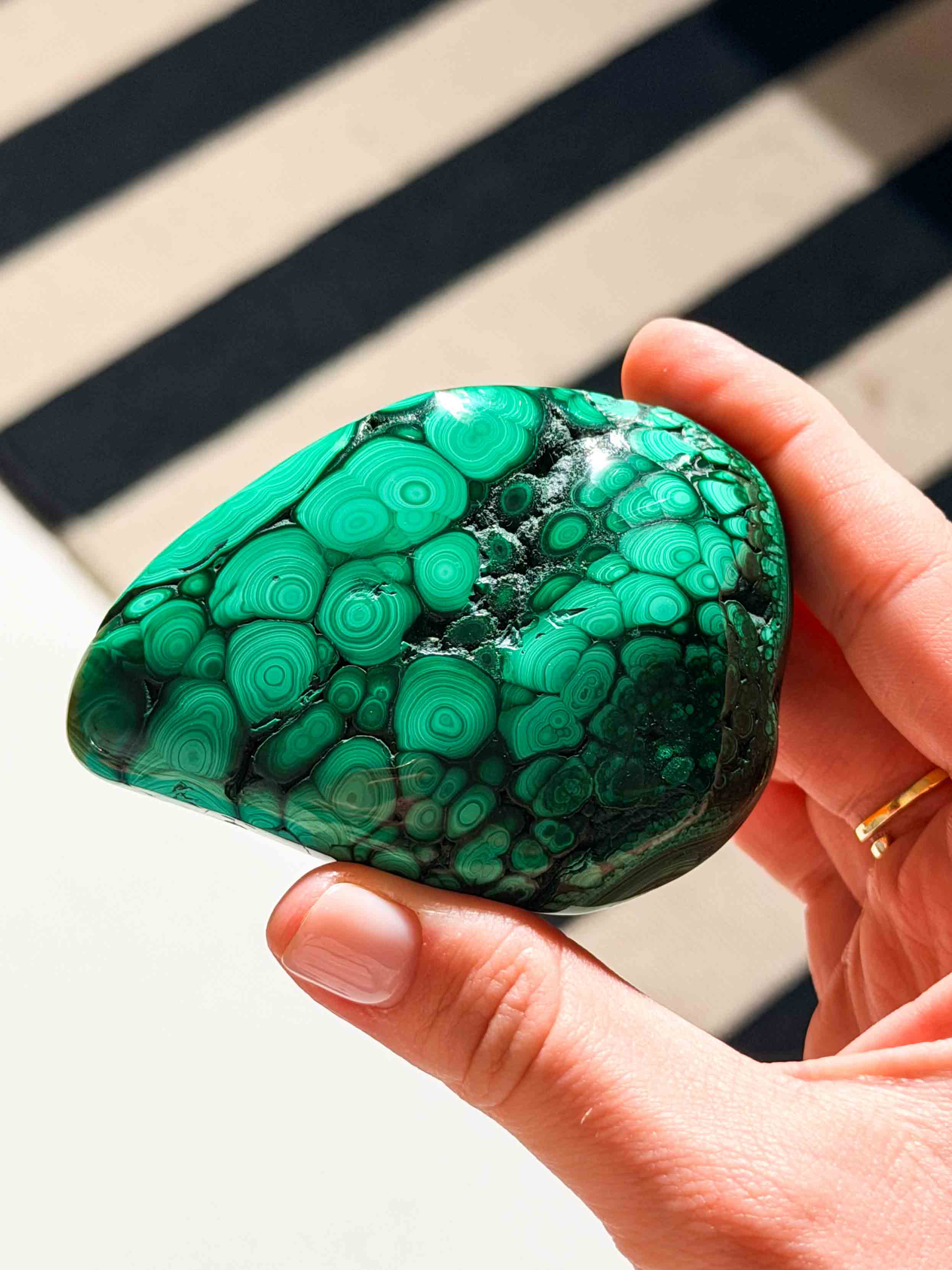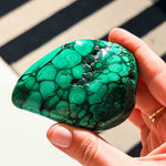 Εντάξτε στη συλλογή σας την ακατέργαστη γοητεία του Φυσικού Μαλαχίτη σε ελεύθερο σχήμα. Λόγω της μοναδικής του κρυστάλλωσης, κάθε κομμάτι αναδεικνύει τα εντυπωσιακά «νερά» και τους σμαραγδένιους δακτυλίους της φύσης με έναν τρόπο εντελώς μοναδικό και οργανικό.