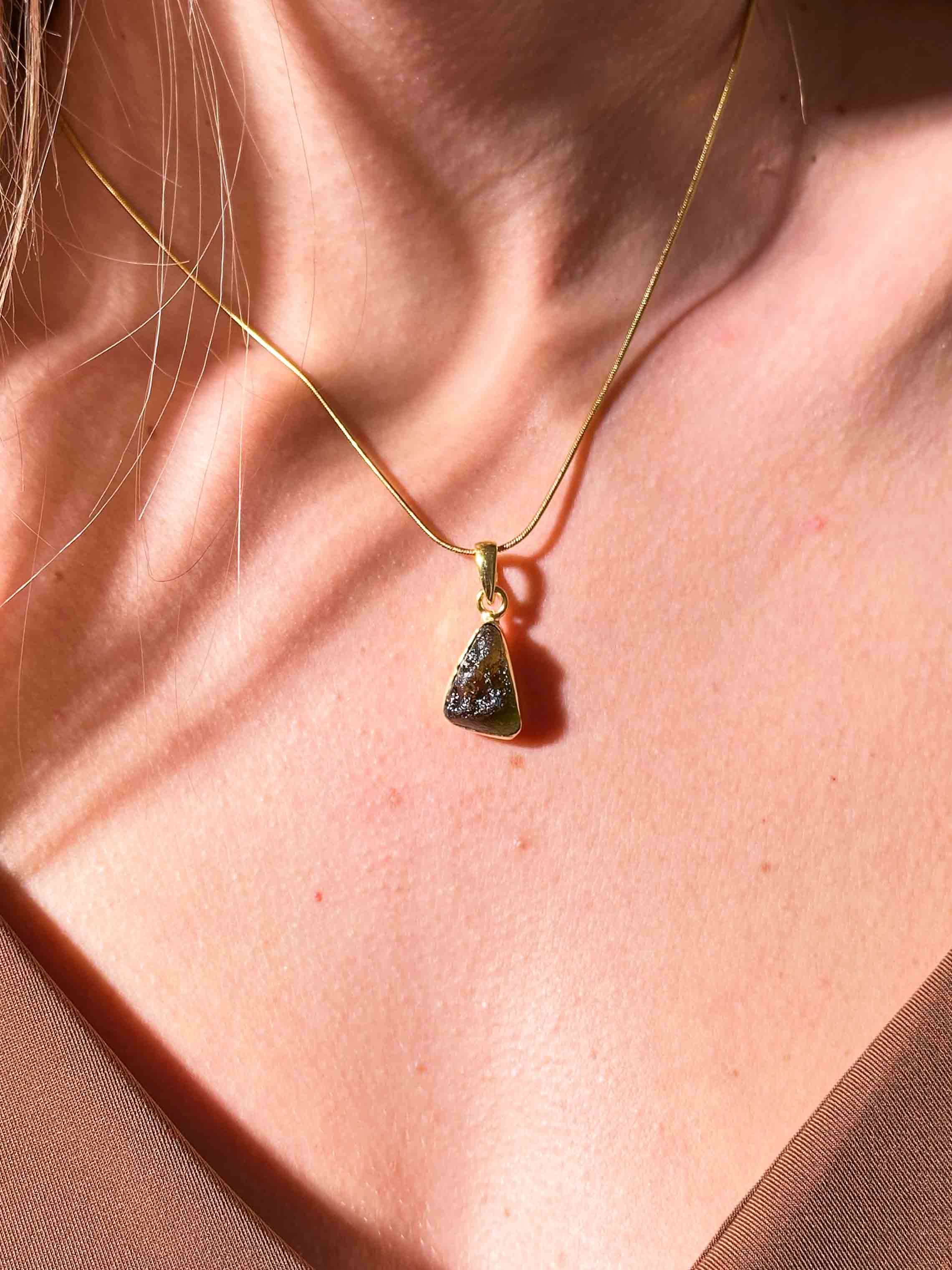 Κάθε μενταγιόν είναι χειροποίητο, αναδεικνύοντας τη φυσική ομορφιά και τη μοναδικότητα του Μολδαβίτη, αποτελώντας έτσι μια διαχρονική προσθήκη σε κάθε συλλογή κοσμημάτων.