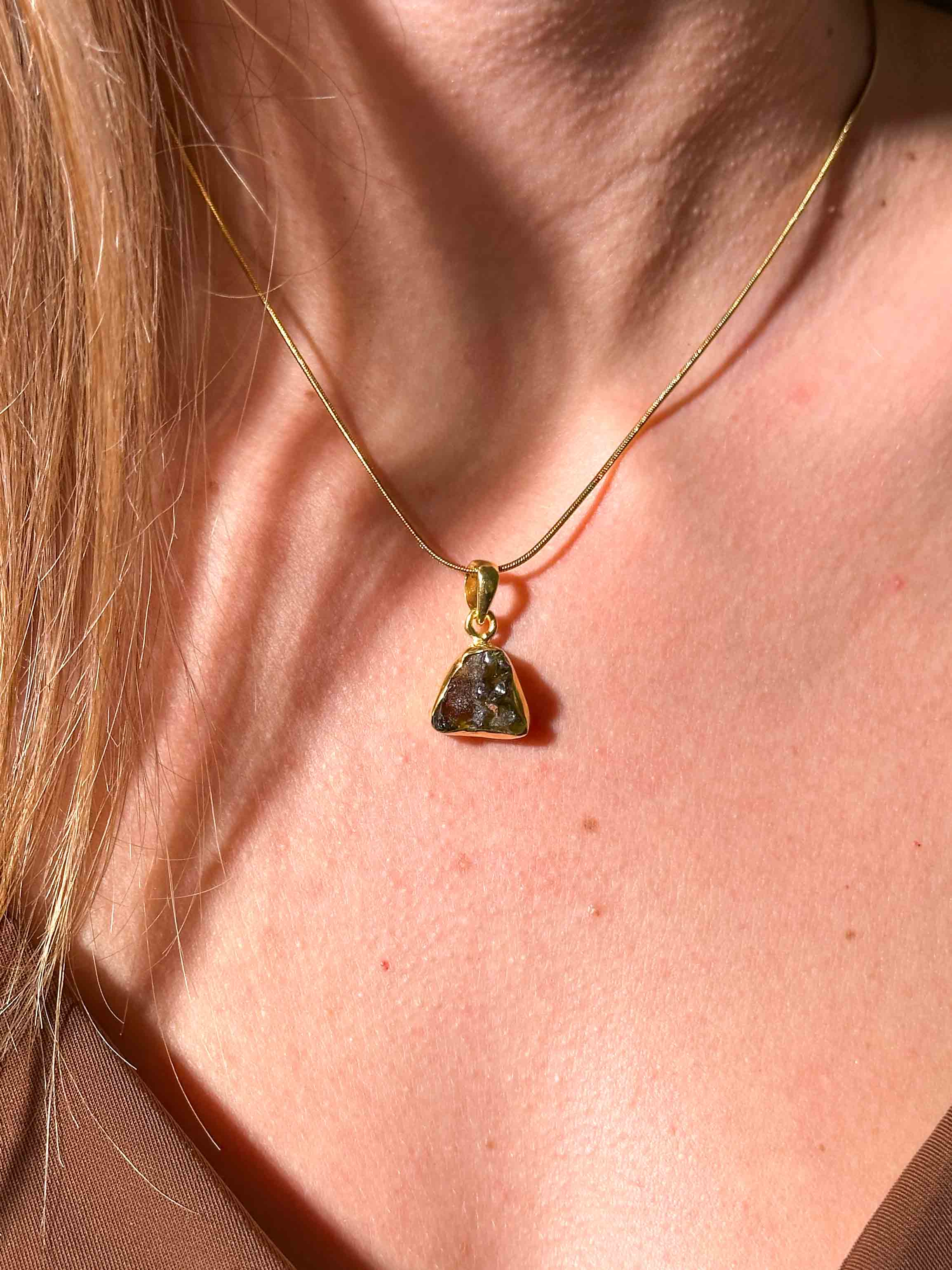Κάθε μενταγιόν είναι χειροποίητο, αναδεικνύοντας τη φυσική ομορφιά και τη μοναδικότητα του Μολδαβίτη, αποτελώντας έτσι μια διαχρονική προσθήκη σε κάθε συλλογή κοσμημάτων.