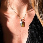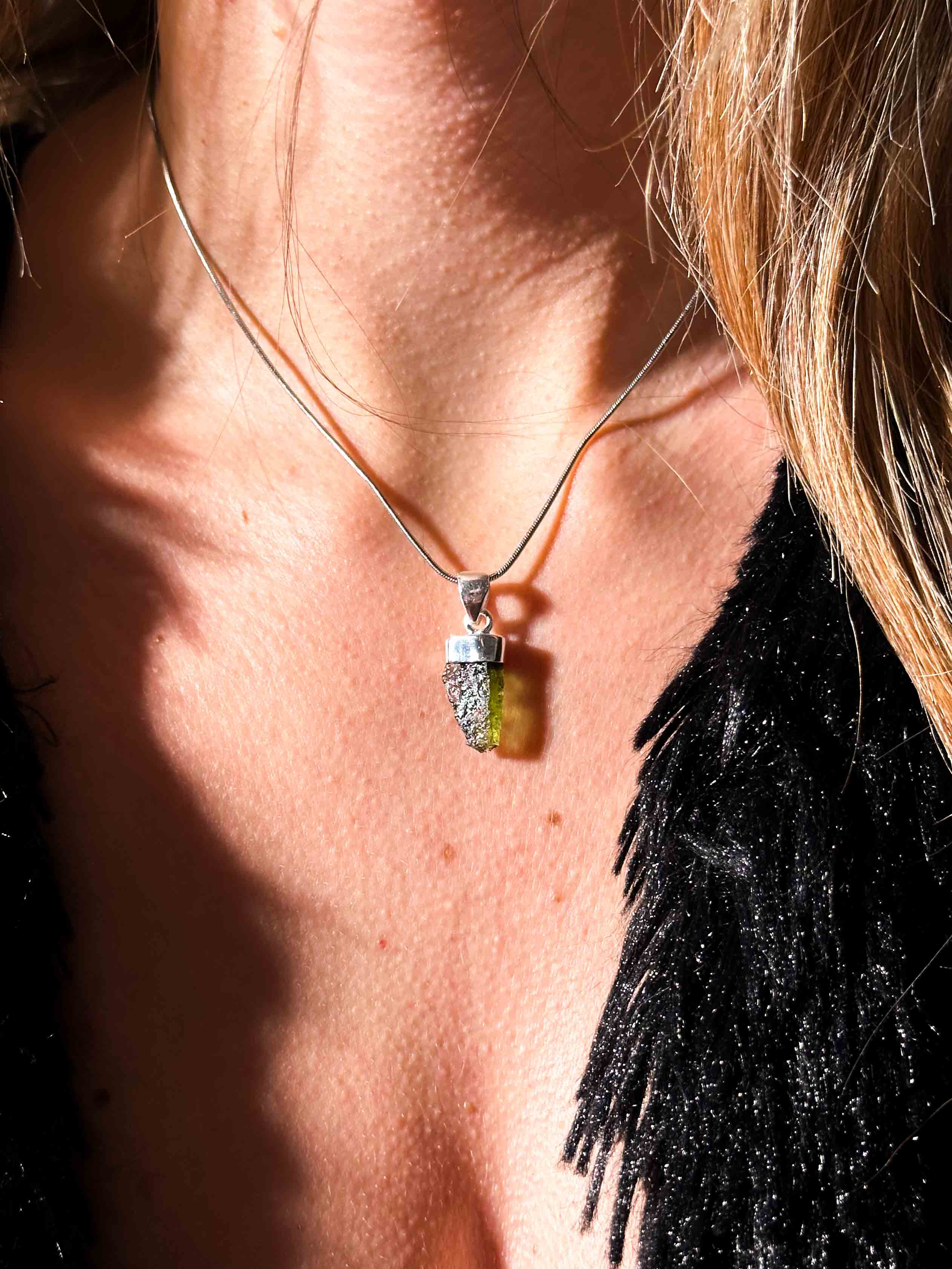 Ανακαλύψτε τη γήινη γοητεία και την κοσμική ενέργεια με αυτό το μοναδικό μενταγιόν Μολδαβίτη. Το κόσμημα διαθέτει έναν αυθεντικό, ακατέργαστο λίθο Μολδαβίτη, με την χαρακτηριστική ανάγλυφη υφή και το βαθύ πράσινο χρώμα του, δεμένο προσεκτικά σε Ασήμι 925 (Sterling Silver). Το λιτό και κομψό ασημένιο δέσιμο αναδεικνύει τη φυσική ομορφιά του λίθου, επιτρέποντας στο φως να διαπερνά την ημιδιαφανή δομή του.