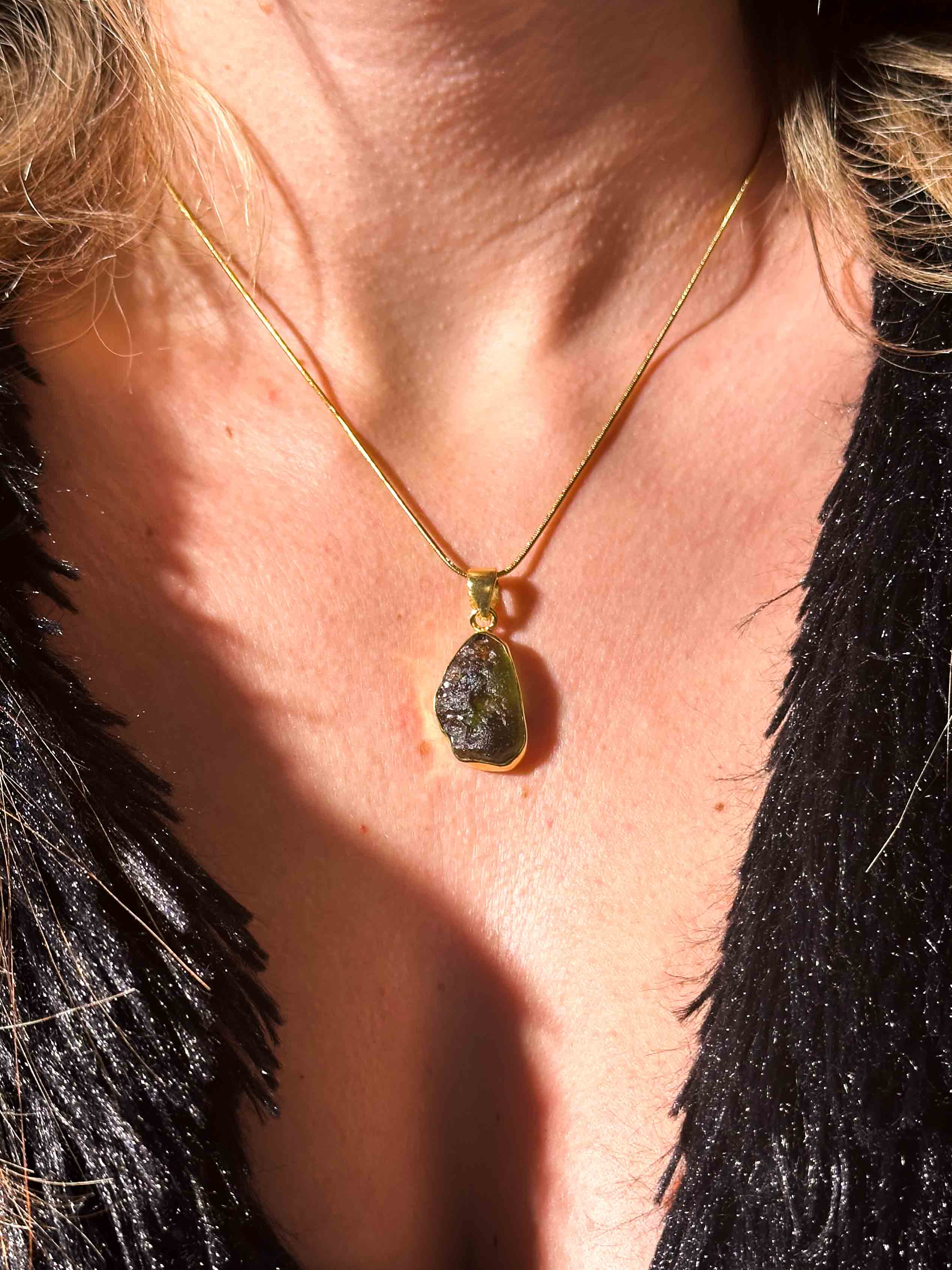 Φορέστε ένα κομμάτι του σύμπαντος στον λαιμό σας. Αυτό το εντυπωσιακό μενταγιόν φιλοξενεί έναν αυθεντικό, ακατέργαστο Μολδαβίτη, δεμένο αριστοτεχνικά σε Ασήμι 925 με πολυτελή επιχρύσωση 24 καρατίων.