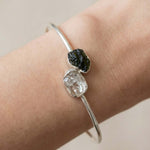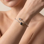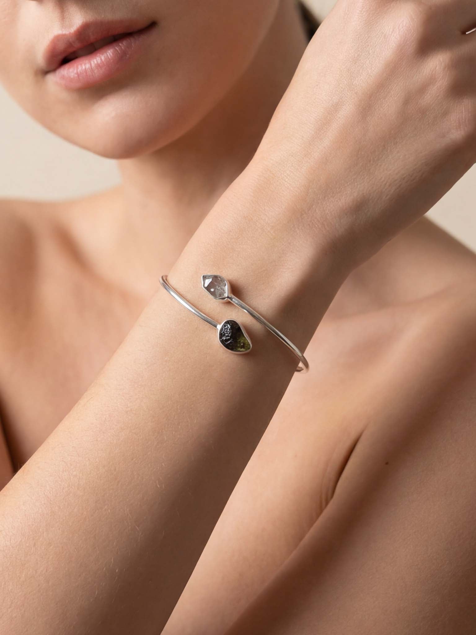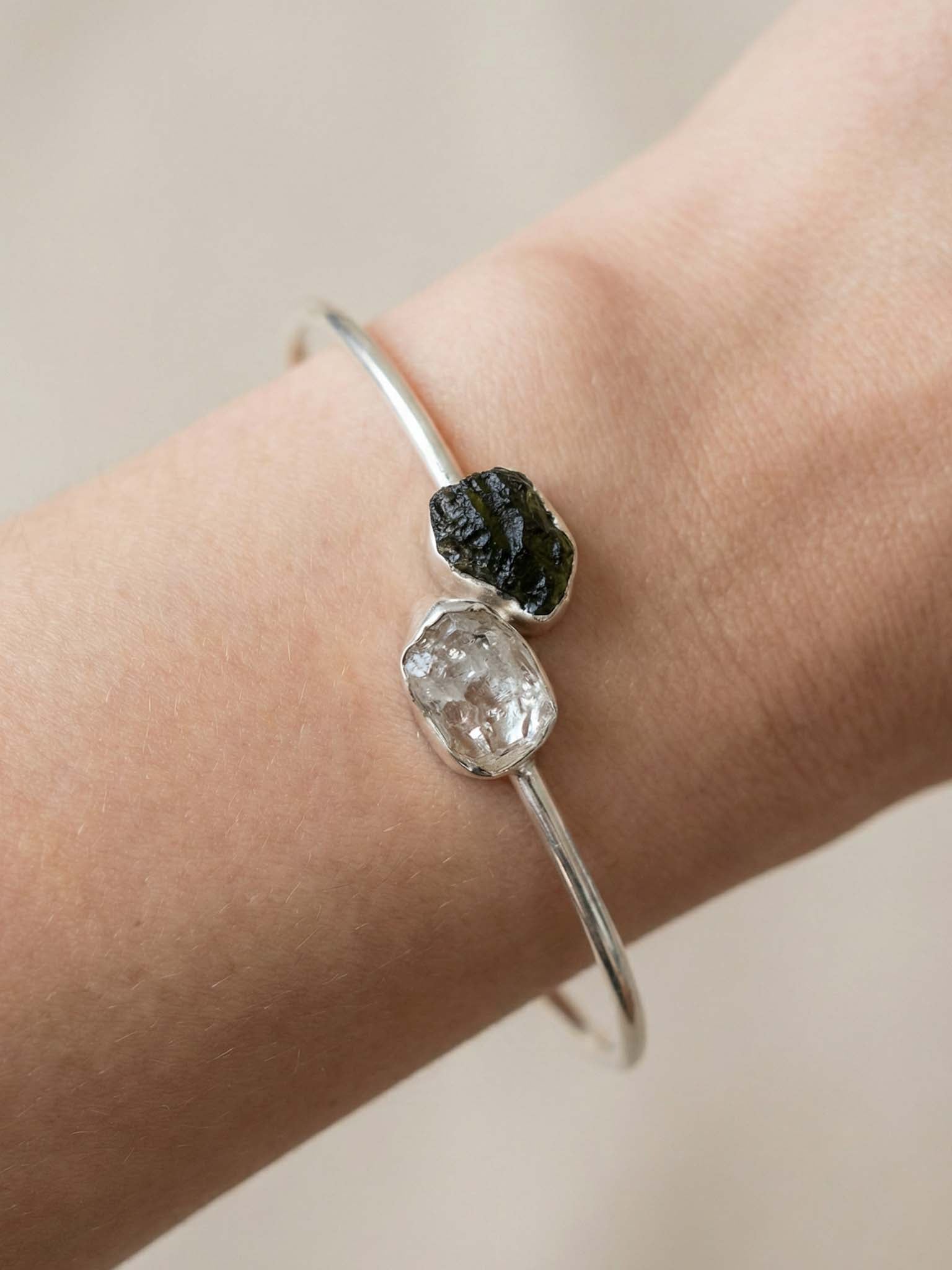 Ένα κόσμημα υψηλής δόνησης για όσους αναζητούν ραγδαία πνευματική εξέλιξη. Αυτό το χειροποίητο βραχιόλι (cuff) από μασίφ Ασήμι 925 ενώνει τον «λίθο των άστρων», τον Μολδαβίτη, με τον πιο δυνατό ενισχυτή του ορυκτού βασιλείου, το Διαμάντι Herkimer.