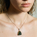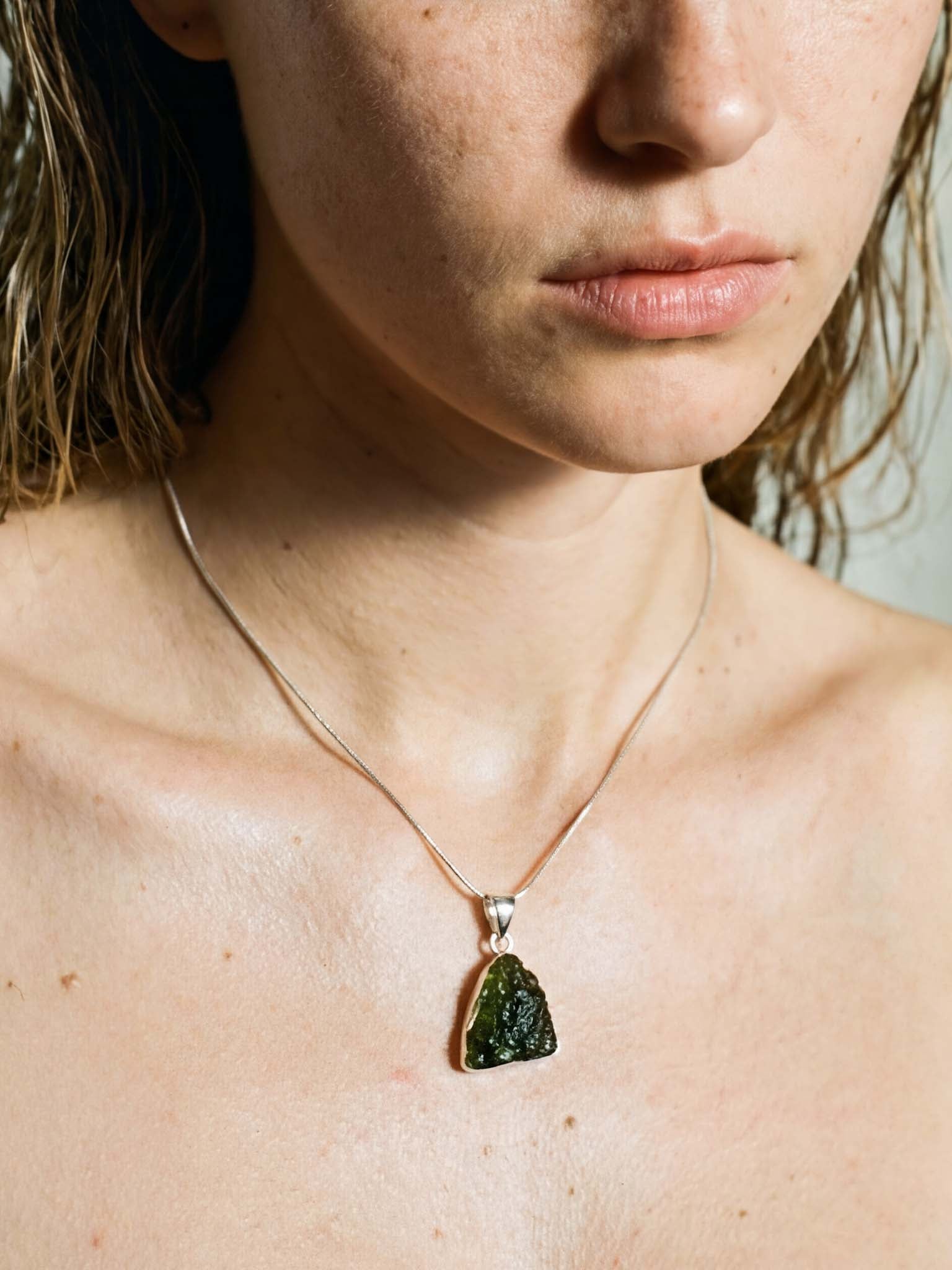 Ανακαλύψτε τη γήινη γοητεία και την κοσμική ενέργεια με αυτό το μοναδικό μενταγιόν Μολδαβίτη. Το κόσμημα διαθέτει έναν αυθεντικό, ακατέργαστο λίθο Μολδαβίτη, με την χαρακτηριστική ανάγλυφη υφή και το βαθύ πράσινο χρώμα του, δεμένο προσεκτικά σε Ασήμι 925 (Sterling Silver). Το λιτό και κομψό ασημένιο δέσιμο αναδεικνύει τη φυσική ομορφιά του λίθου, επιτρέποντας στο φως να διαπερνά την ημιδιαφανή δομή του.