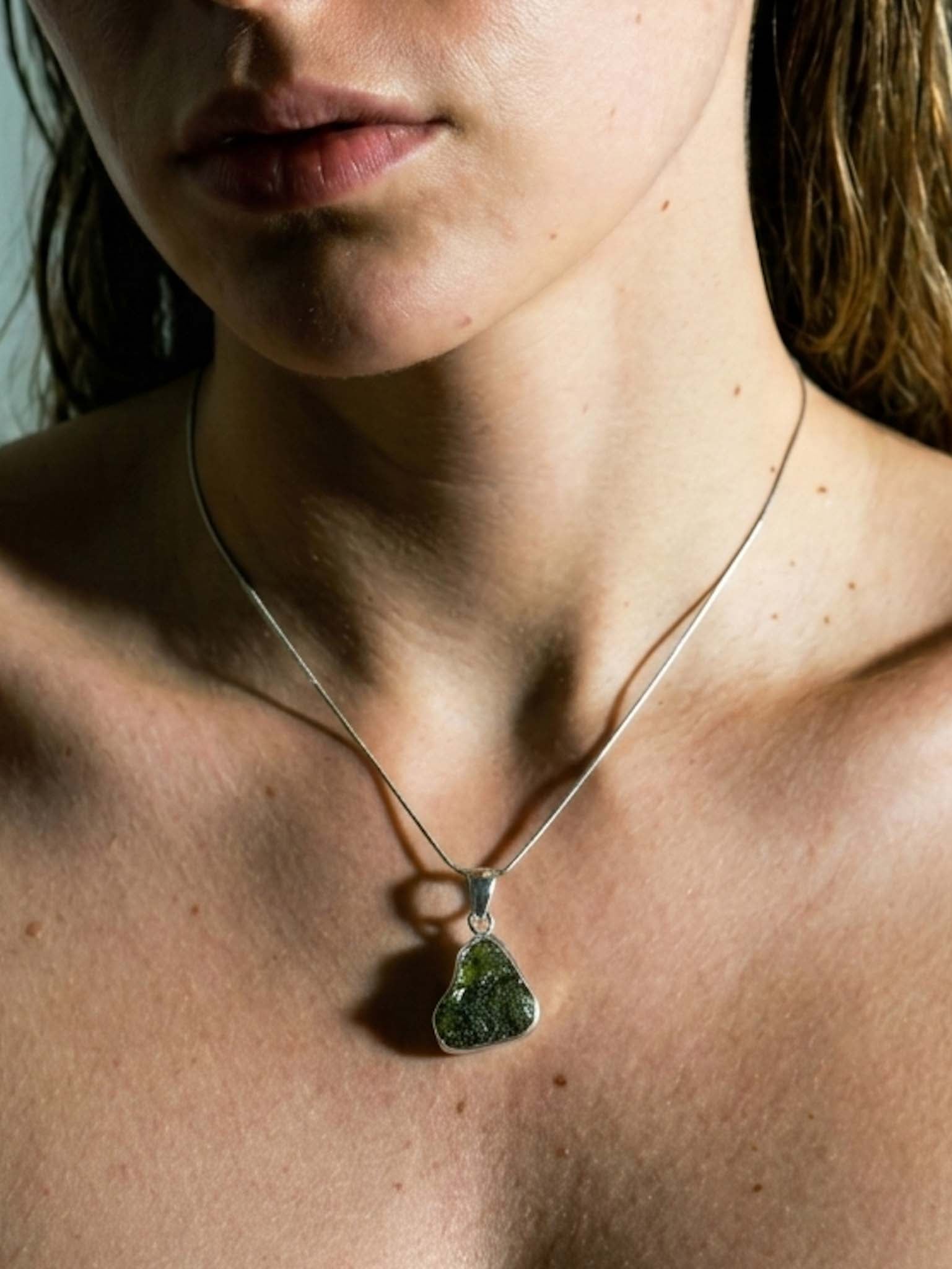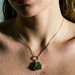 Ανακαλύψτε τη γήινη γοητεία και την κοσμική ενέργεια με αυτό το μοναδικό μενταγιόν Μολδαβίτη. Το κόσμημα διαθέτει έναν αυθεντικό, ακατέργαστο λίθο Μολδαβίτη, με την χαρακτηριστική ανάγλυφη υφή και το βαθύ πράσινο χρώμα του, δεμένο προσεκτικά σε Ασήμι 925 (Sterling Silver). Το λιτό και κομψό ασημένιο δέσιμο αναδεικνύει τη φυσική ομορφιά του λίθου, επιτρέποντας στο φως να διαπερνά την ημιδιαφανή δομή του.