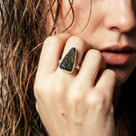 Κρατήστε στα χέρια σας ένα κομμάτι από τα αστέρια. Αυτό το εντυπωσιακό ρυθμιζόμενο δαχτυλίδι συνδυάζει την πολυτέλεια του Ασημιού 925 και τη μυστικιστική ενέργεια του Μολδαβίτη. Το βαθύ, δασώδες πράσινο του λίθου αναδεικνύεται μοναδικά μέσα από τη χρυσή λάμψη του μετάλλου, δημιουργώντας ένα κόσμημα που μαγνητίζει.