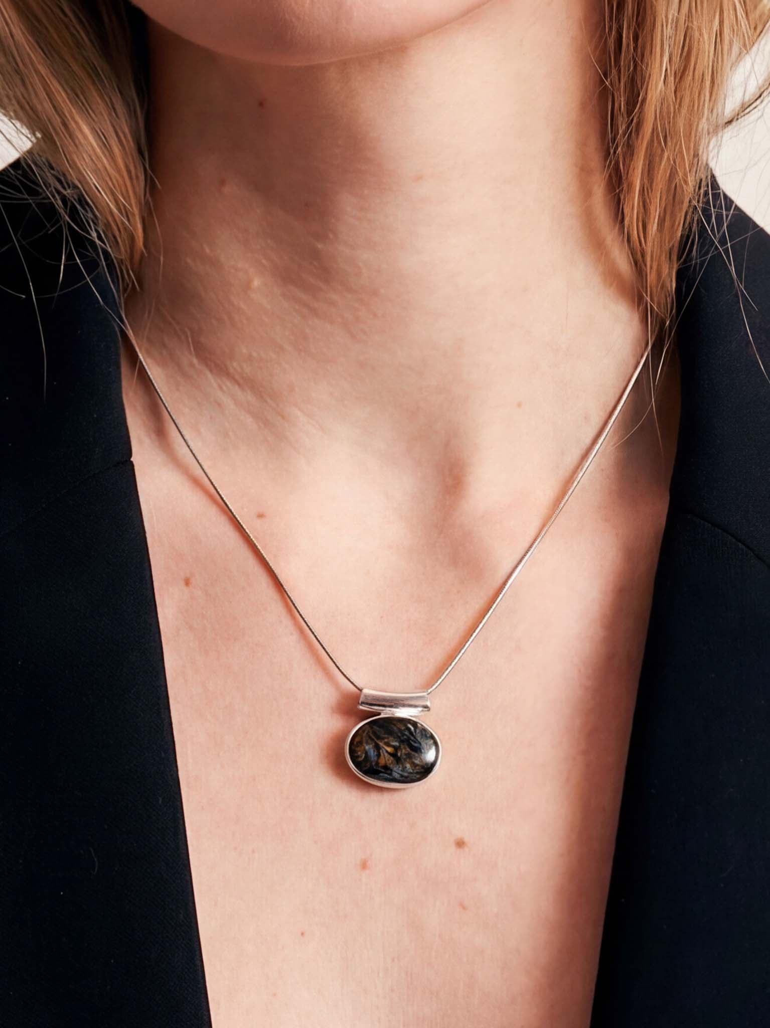 Αυτό το εντυπωσιακό μενταγιόν με Πιετερσίτη είναι ένα κόσμημα γεμάτο κίνηση και δυναμισμό. Γνωστός ως ο "λίθος της καταιγίδας", ο Πιετερσίτης μαγνητίζει με το μοναδικό του μοτίβο από στροβιλιστές χρυσές, μπλε, καφέ και μαύρες ίνες, που μοιάζουν με έναν πίνακα αφηρημένης τέχνης ή μια ουράνια δίνη μέσα στην πέτρα. Κάθε λίθος είναι ένα μικρό, φυσικό θαύμα.