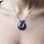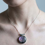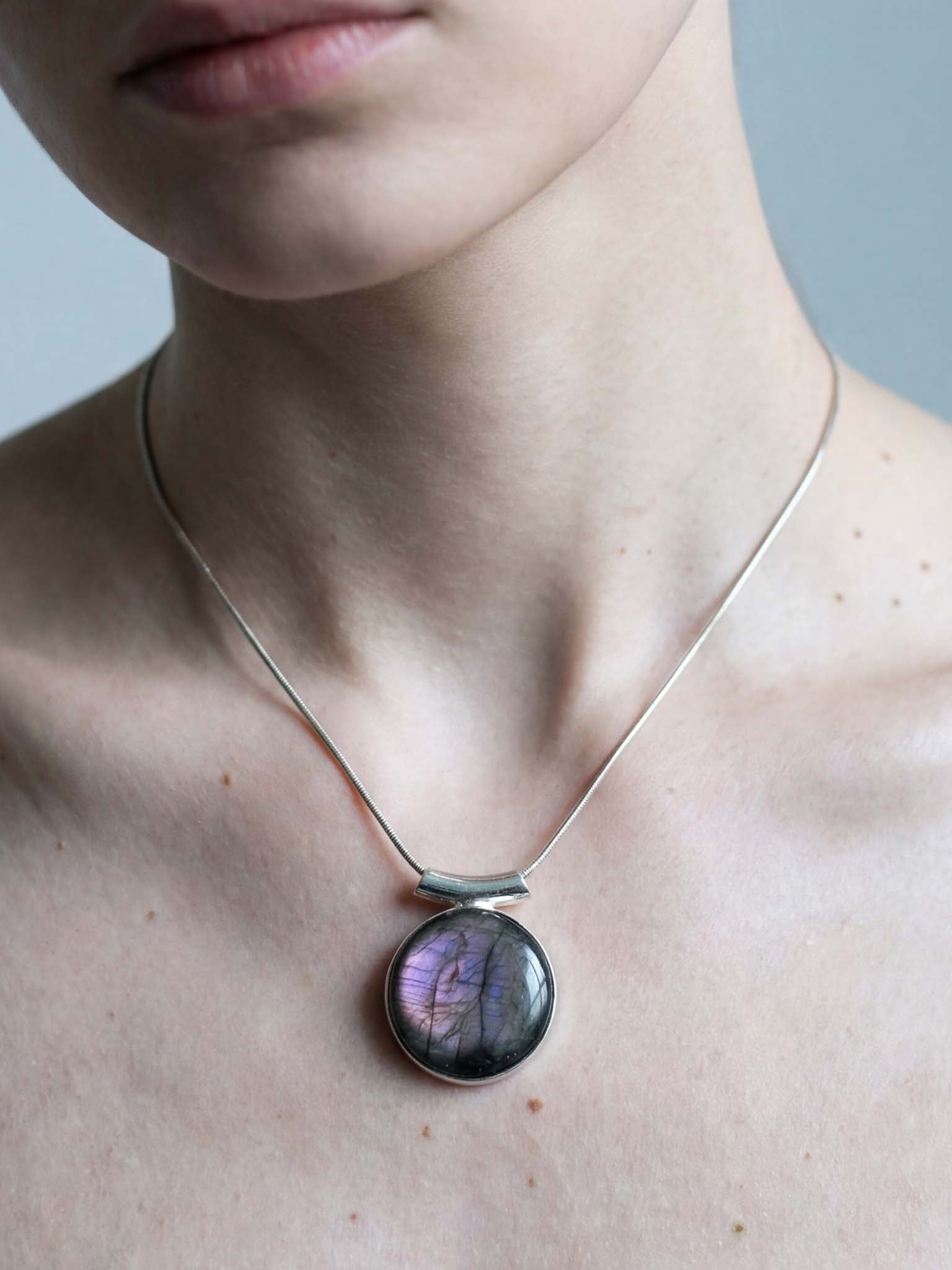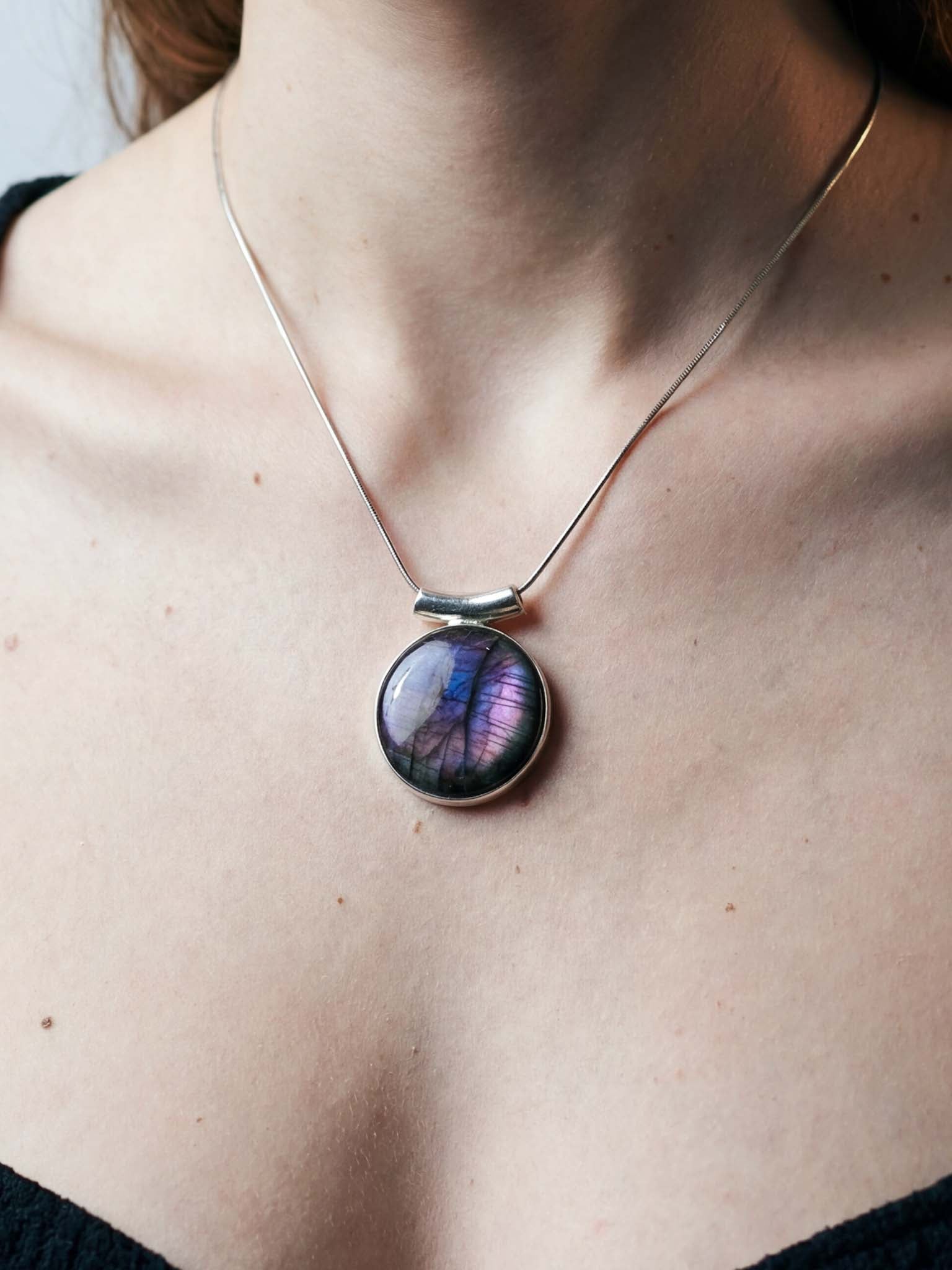 Κλέψτε τις εντυπώσεις και αναδείξτε το προσωπικό σας στυλ με αυτό το επιβλητικό και άκρως σαγηνευτικό μενταγιόν. Στο επίκεντρο του κοσμήματος βρίσκεται ένας εντυπωσιακός σε μέγεθος, φυσικός Μωβ Λαβραδορίτης σε κλασική οβάλ κοπή, περίτεχνα και λιτά δεμένος σε Ασήμι 925, ώστε να αφήνει την πέτρα να πρωταγωνιστεί.