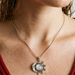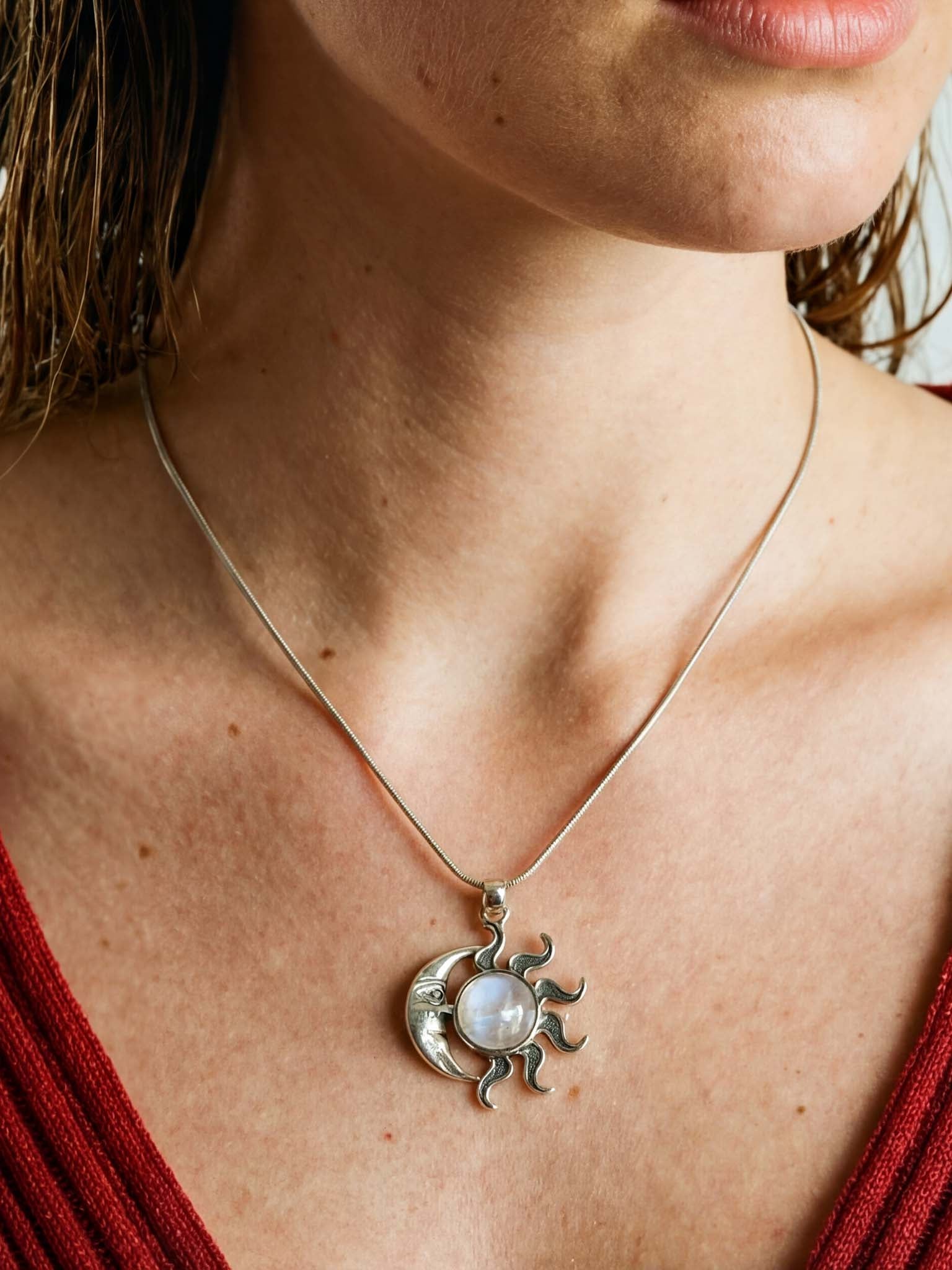 Μαγνητίστε τα βλέμματα με αυτό το περίτεχνο και άκρως συμβολικό μενταγιόν. Το κόσμημα απεικονίζει την αιώνια ένωση του Ήλιου και της Σελήνης, με το πρόσωπο του φεγγαριού σκαλισμένο με εξαιρετική λεπτομέρεια. Στο κέντρο αυτού του ουράνιου χορού, δεσπόζει μια εκθαμβωτική, φυσική Φεγγαρόπετρα Rainbow, προσεκτικά δεμένη σε Ασήμι 925.