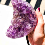 Ο Ακατέργαστος Αμέθυστος διατηρεί τη φυσική του ομορφιά και δύναμη, με κρυστάλλους που σχηματίζουν εντυπωσιακές κορυφές και κοιλότητες. Η μορφή της ημισελήνου ενισχύει τη σύνδεσή του με τη Σελήνη, συμβολίζοντας την ανανέωση, τη διαίσθηση και τη θηλυκή ενέργεια. Τοποθετημένος σε μεταλλικό σταντ, αναδεικνύεται ως ένα ξεχωριστό διακοσμητικό κομμάτι με έντονη ενεργειακή παρουσία.