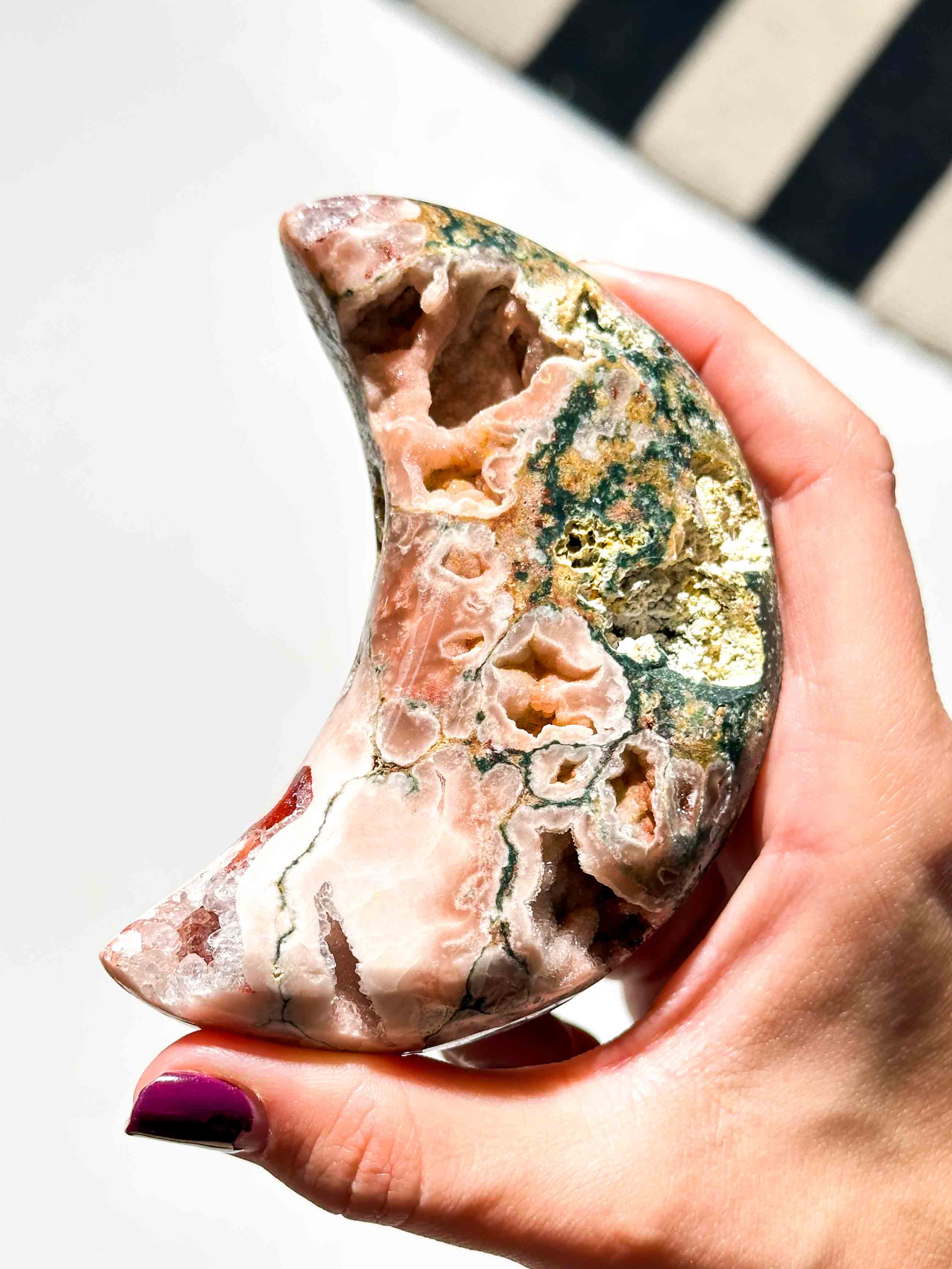 Η ημισέληνος από Ροζ Αμέθυστο συνδυάζει την ενέργεια της Σελήνης με τη θεραπευτική δύναμη του κρυστάλλου, αποτελώντας ισχυρό σύμβολο αναγέννησης, θηλυκότητας και εσωτερικής σοφίας.