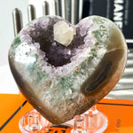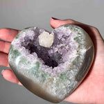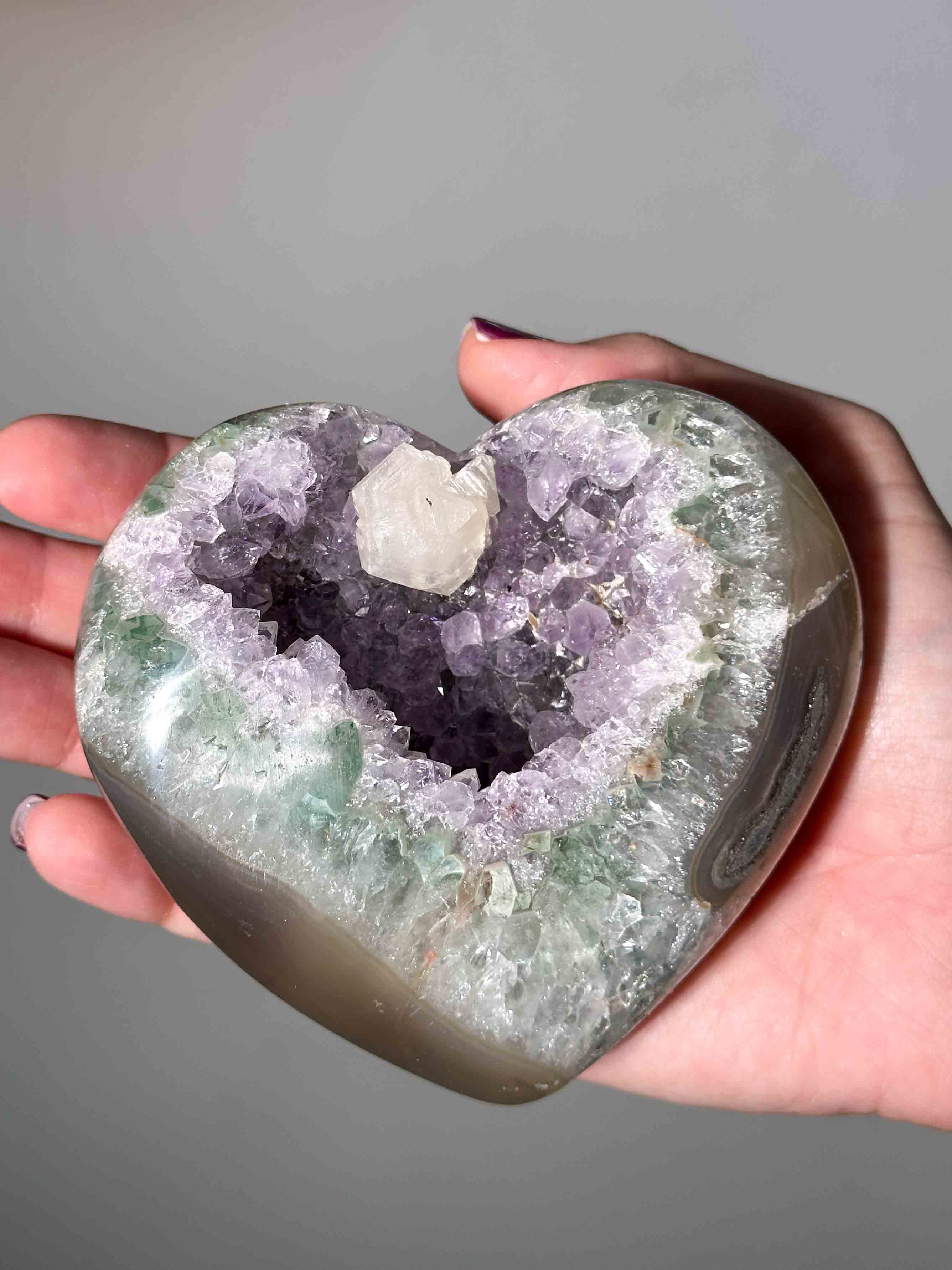 Ένα ξεχωριστό και σπάνιο φυσικό έργο τέχνης. Ο Αμέθυστος, γνωστός ως λίθος γαλήνης και πνευματικής διαύγειας, ενισχύει την ηρεμία και την προστασία, ενώ ο Καλσίτης στο κέντρο προσθέτει καθαρότητα, ανανέωση και ενέργεια ανάπτυξης. Ο συνδυασμός τους δημιουργεί μια ισχυρή αρμονία που βοηθά στη συναισθηματική ισορροπία και την πνευματική ενδυνάμωση.