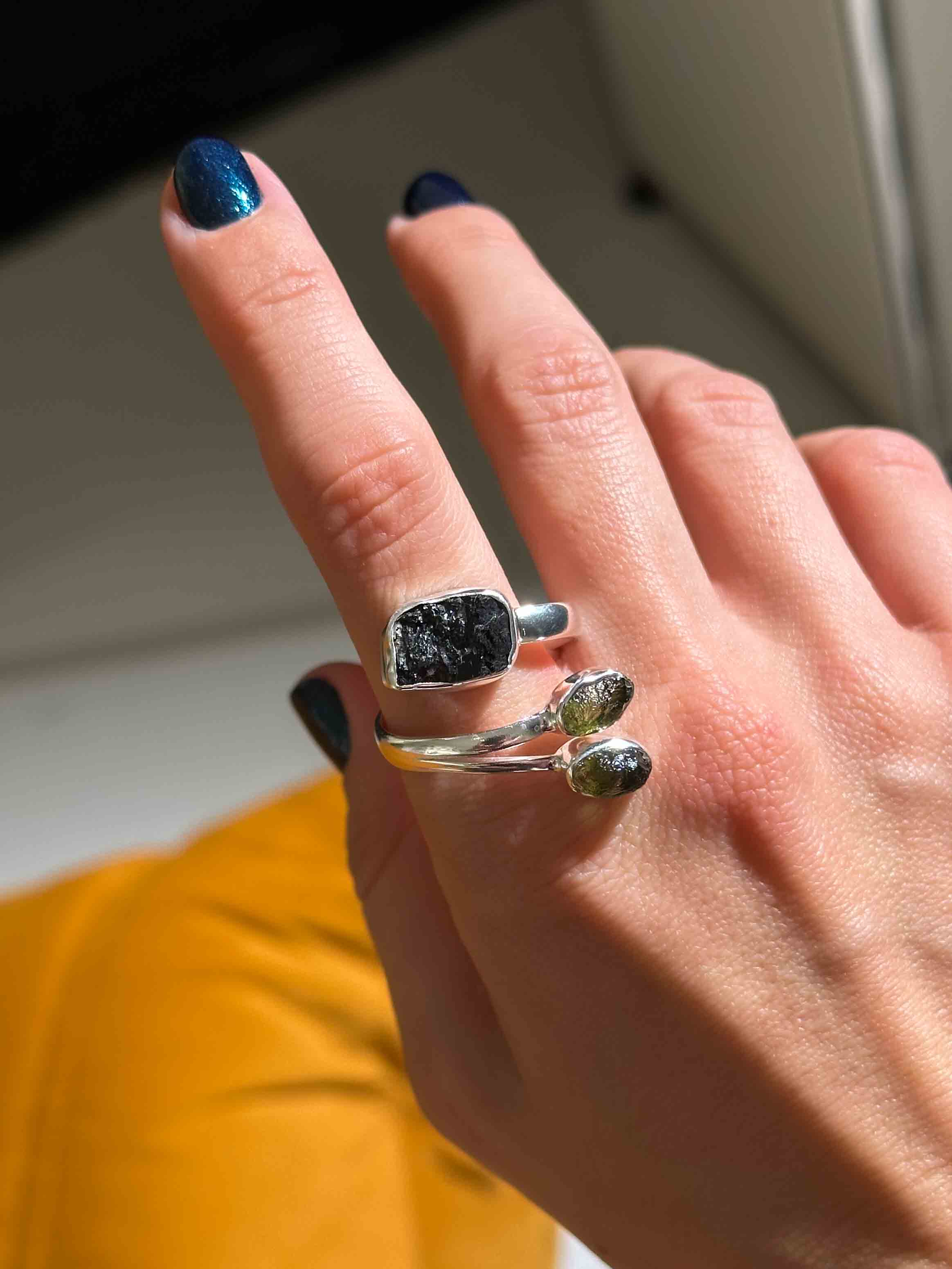 Ένα δαχτυλίδι που ενώνει τη δύναμη της γης με την ενέργεια του σύμπαντος. Η ακατέργαστη Μαύρη Τουρμαλίνη στο κέντρο του ακτινοβολεί προστασία, γείωση και σταθερότητα, ενώ οι δύο Μολδαβίτες σε σχήμα δάκρυ φέρνουν την κοσμική ενέργεια, την πνευματική αφύπνιση και την αίσθηση σύνδεσης με το άπειρο. Ο συνδυασμός τους δημιουργεί ένα φυλαχτό ισχυρής ενέργειας και σπάνιας ομορφιάς.