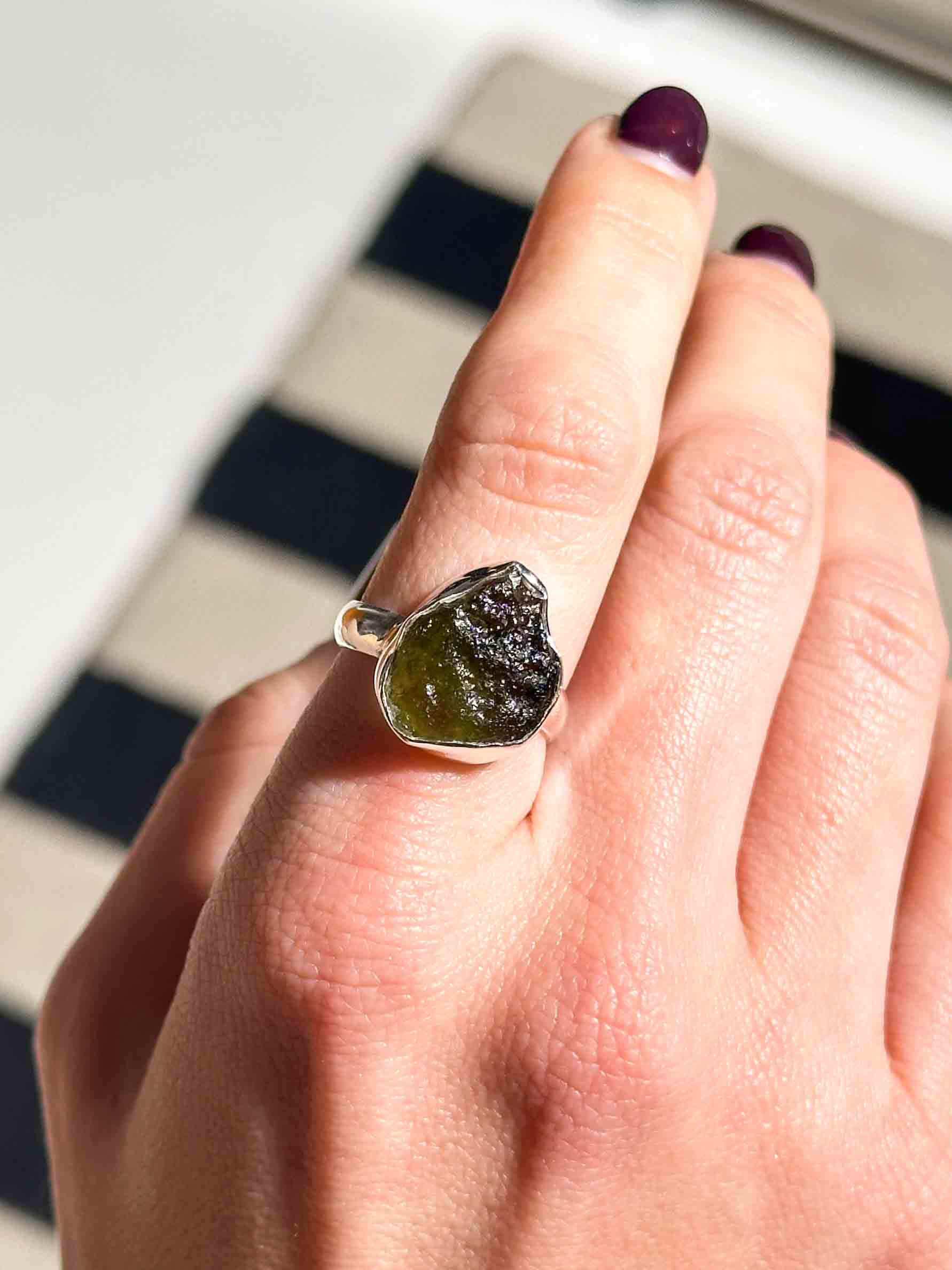 Κρατήστε τη δύναμη του σύμπαντος στα χέρια σας. Αυτό το χειροποίητο δαχτυλίδι από Ασήμι 925 αγκαλιάζει έναν αυθεντικό, ακατέργαστο Μολδαβίτη, τον πιο περιζήτητο τεκτίτη στον κόσμο.